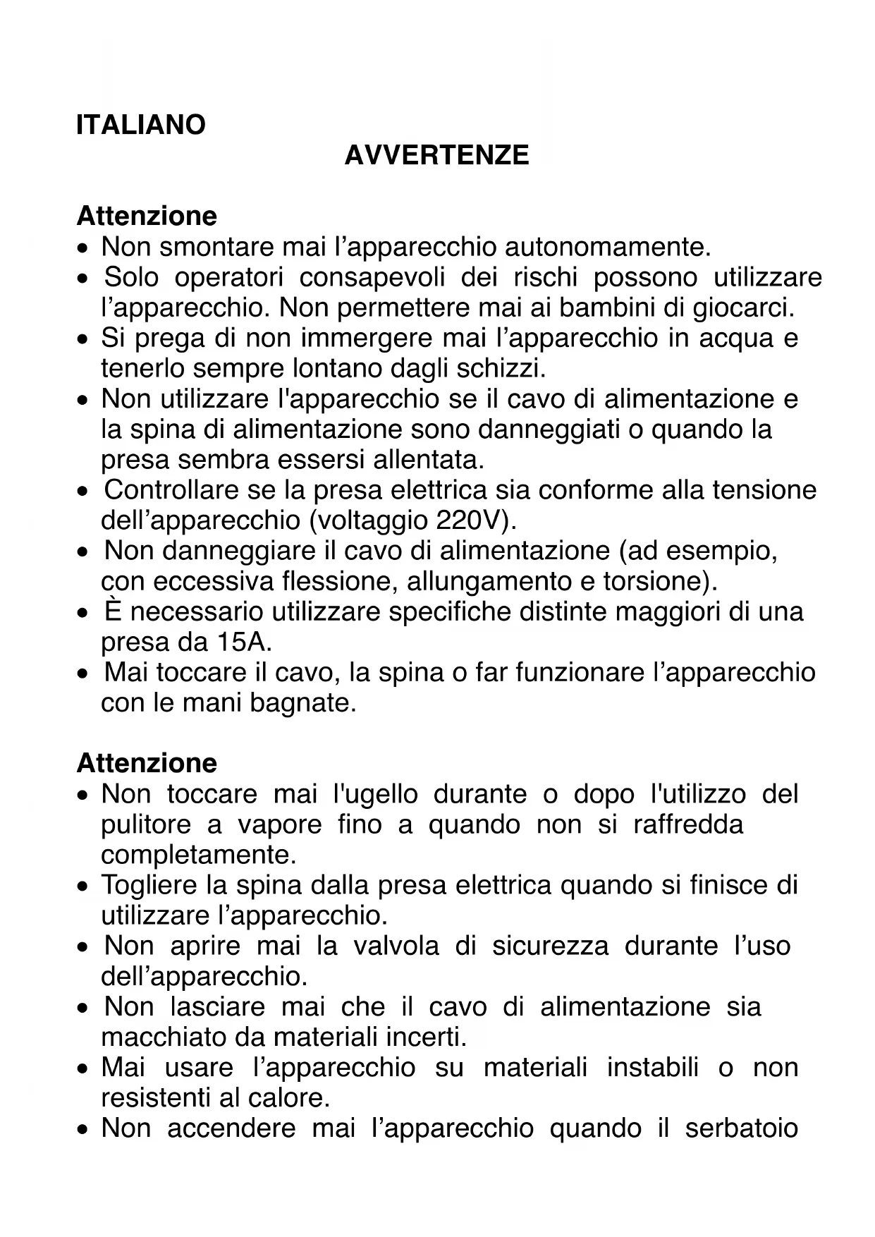 - Mai toccare il cavo, la spina o far funzionare l’apparecchio con le mani bagnate. Attenzione