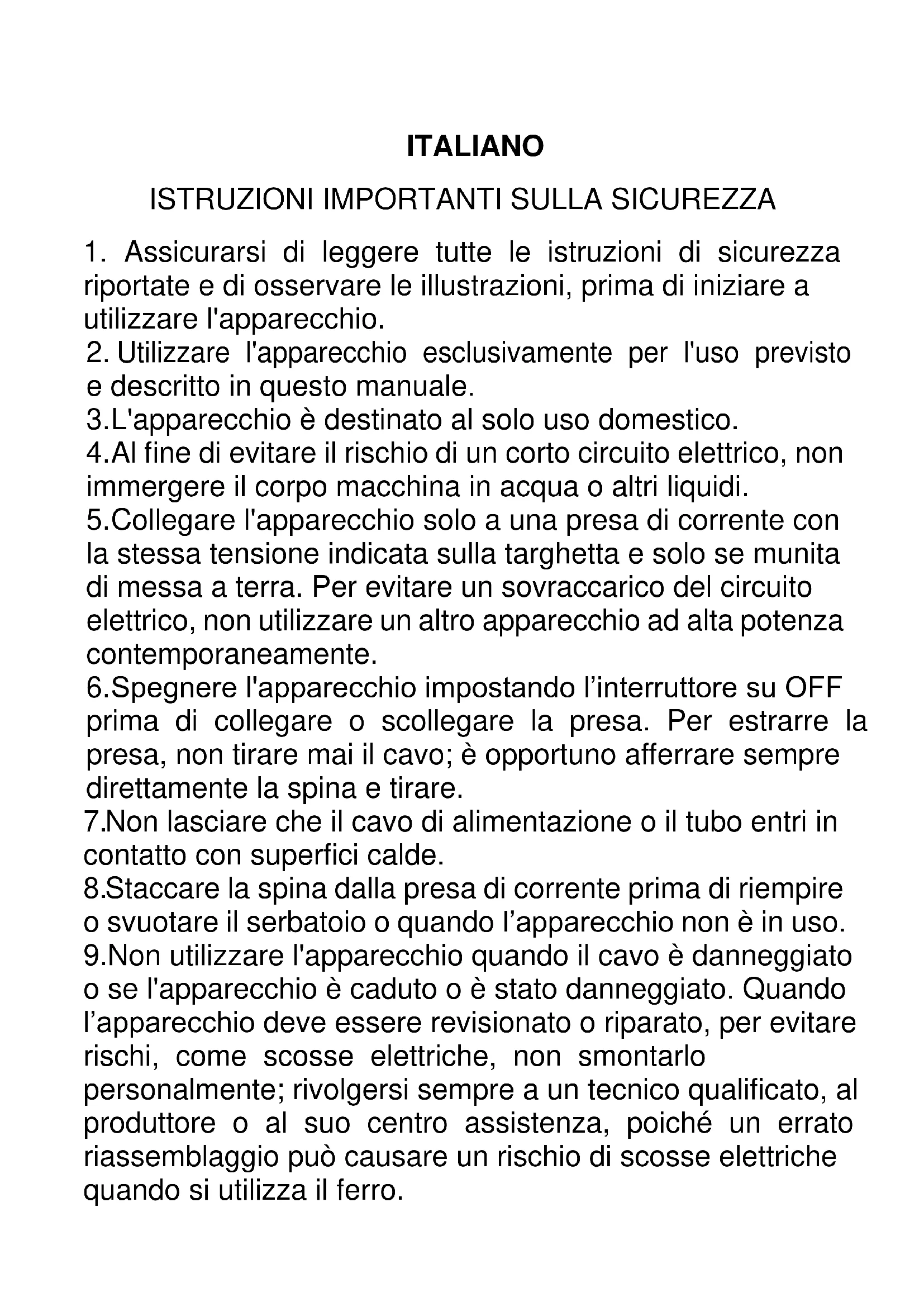Staccare la spina dalla presa di corrente prima di riempire o svuotare il serbatoio o quando l’apparecchio non è in uso. 9.Non utilizzare l'apparecchio quando il cavo è danneggiato o se l'apparecchio è caduto o è stato danneggiato. Quando l’apparecchio deve essere revisionato o riparato, per evitare rischi, come scosse elettriche, non smontarlo personalmente; rivolgersi sempre a un tecnico qualificato, al produttore o al suo centro assistenza, poiché un errato riassemblaggio può causare un rischio di scosse elettriche quando si utilizza il ferro.10. Tenere il ferro fuori dalla portata dei bambini; prestare la massima attenzione quando si utilizza l’apparecchio in presenza di bambini. Non lasciare il ferro da stiro incustodito mentre è collegato alla rete di alimentazione.