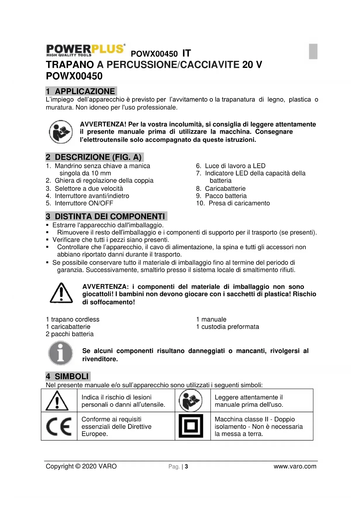 Macchina classe II - Doppio isolamento - Non è necessaria la messa a terra.POWX00450 IT Copyright © 2022 VARO Pag. | 4 www.varo.com