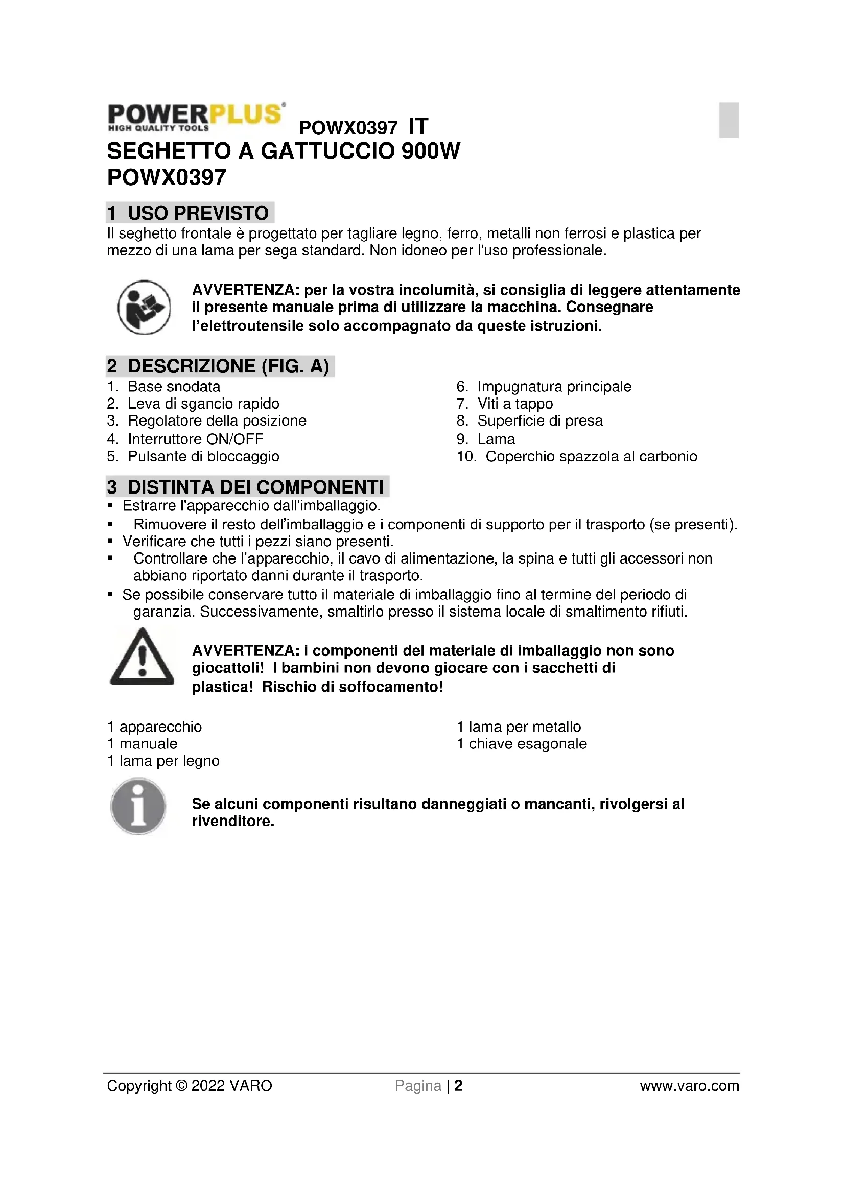 POWX0397 1 USO PREVISTO Il seghetto frontale è progettato per tagliare legno, ferro, metalli non ferrosi e plastica per mezzo di una lama per sega standard. Non idoneo per l'uso professionale. AVVERTENZA: per la vostra incolumità, si consiglia di leggere attentamente il presente manuale prima di utilizzare la macchina. Consegnare l’elettroutensile solo accompagnato da queste istruzioni. 2 DESCRIZIONE (FIG. A)