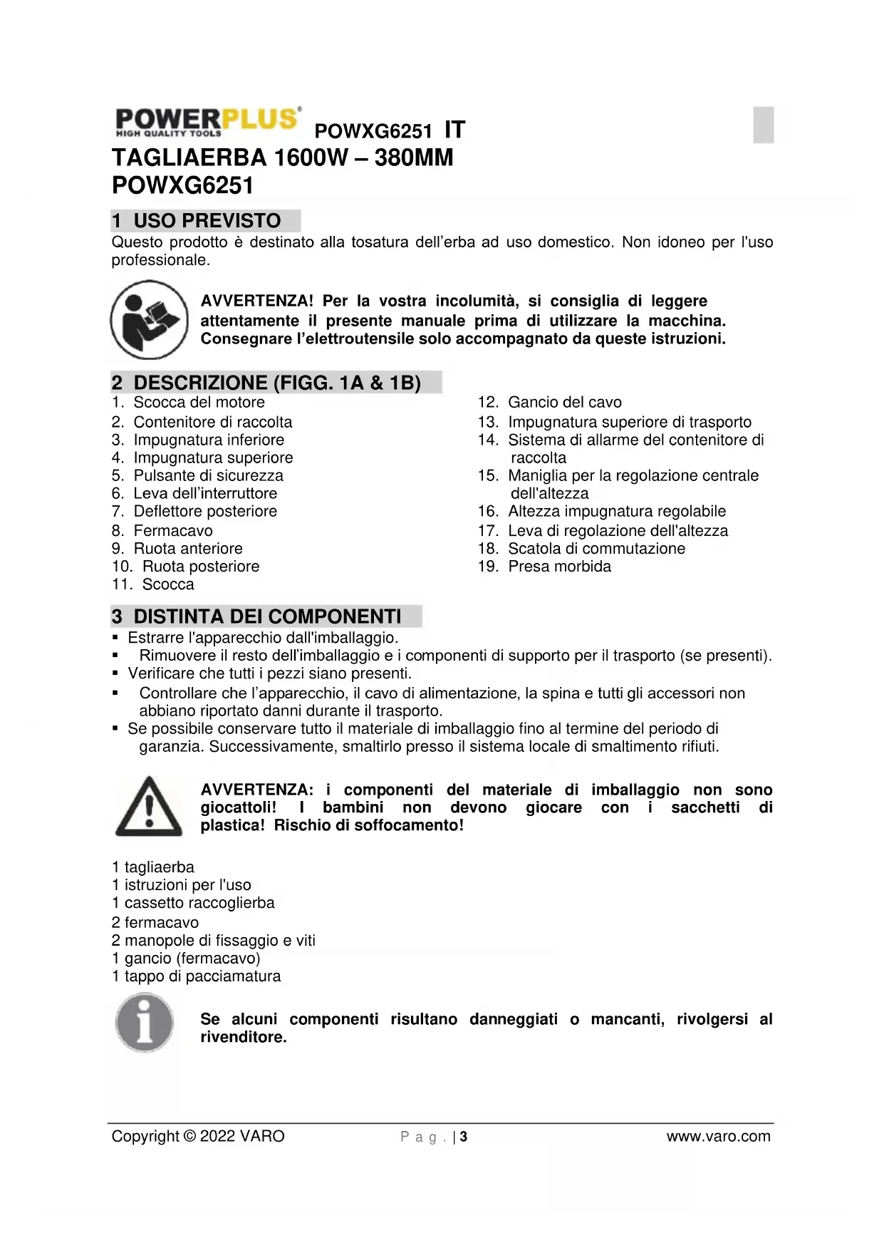 - Se possibile conservare tutto il materiale di imballaggio fino al termine del periodo di garanzia. Successivamente, smaltirlo presso il sistema locale di smaltimento rifiuti. AVVERTENZA: i componenti del materiale di imballaggio non sono giocattoli! I bambini non devono giocare con i sacchetti di plastica! Rischio di soffocamento! 1 tagliaerba 1 istruzioni per l'uso 1 cassetto raccoglierba 2 fermacavo 2 manopole di fissaggio e viti 1 gancio (fermacavo) 1 tappo di pacciamatura Se alcuni componenti risultano danneggiati o mancanti, rivolgersi al rivenditore.POWXG6251 IT Copyright © 2022 VARO P a g . | 4 www.varo.com 4 SIMBOLI Nel presente manuale e/o sulla macchina sono utilizzati i seguenti simboli: