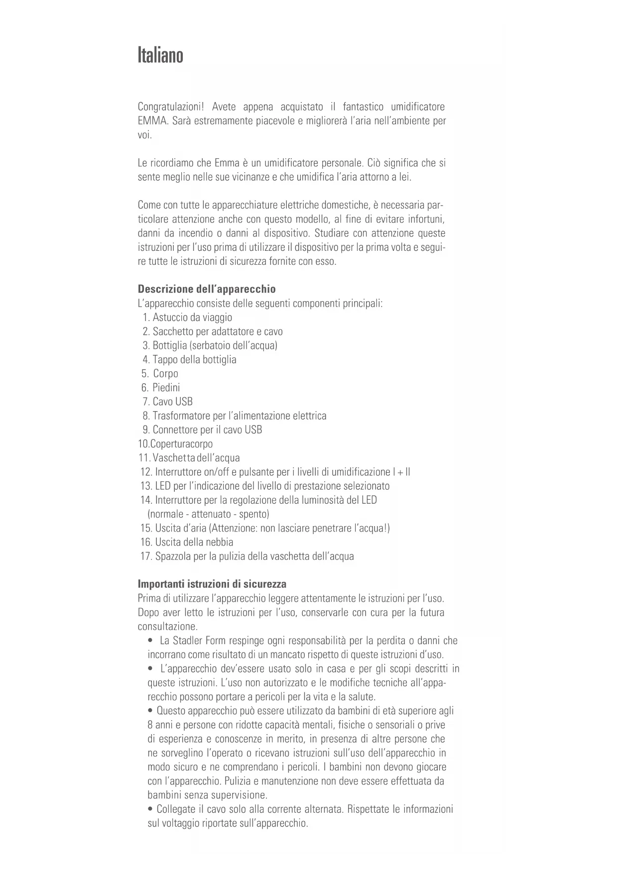 Scarica le istruzioni per il tuo Umidificatore in formato PDF gratuitamente! Trova il tuo manuale Emma - STADLER FORM e riprendi in mano il tuo dispositivo elettronico. In questa pagina sono pubblicati tutti i documenti necessari per l'utilizzo del tuo dispositivo. Emma del marchio STADLER FORM.