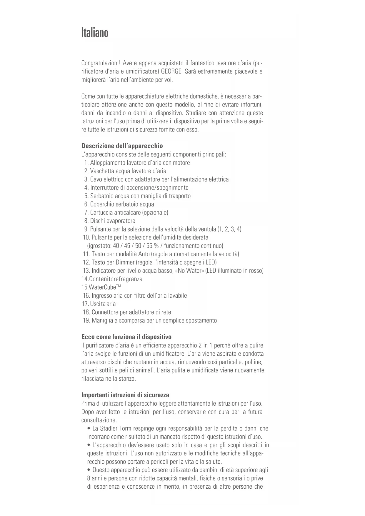 Scarica le istruzioni per il tuo Umidificatore in formato PDF gratuitamente! Trova il tuo manuale George - STADLER FORM e riprendi in mano il tuo dispositivo elettronico. In questa pagina sono pubblicati tutti i documenti necessari per l'utilizzo del tuo dispositivo. George del marchio STADLER FORM.