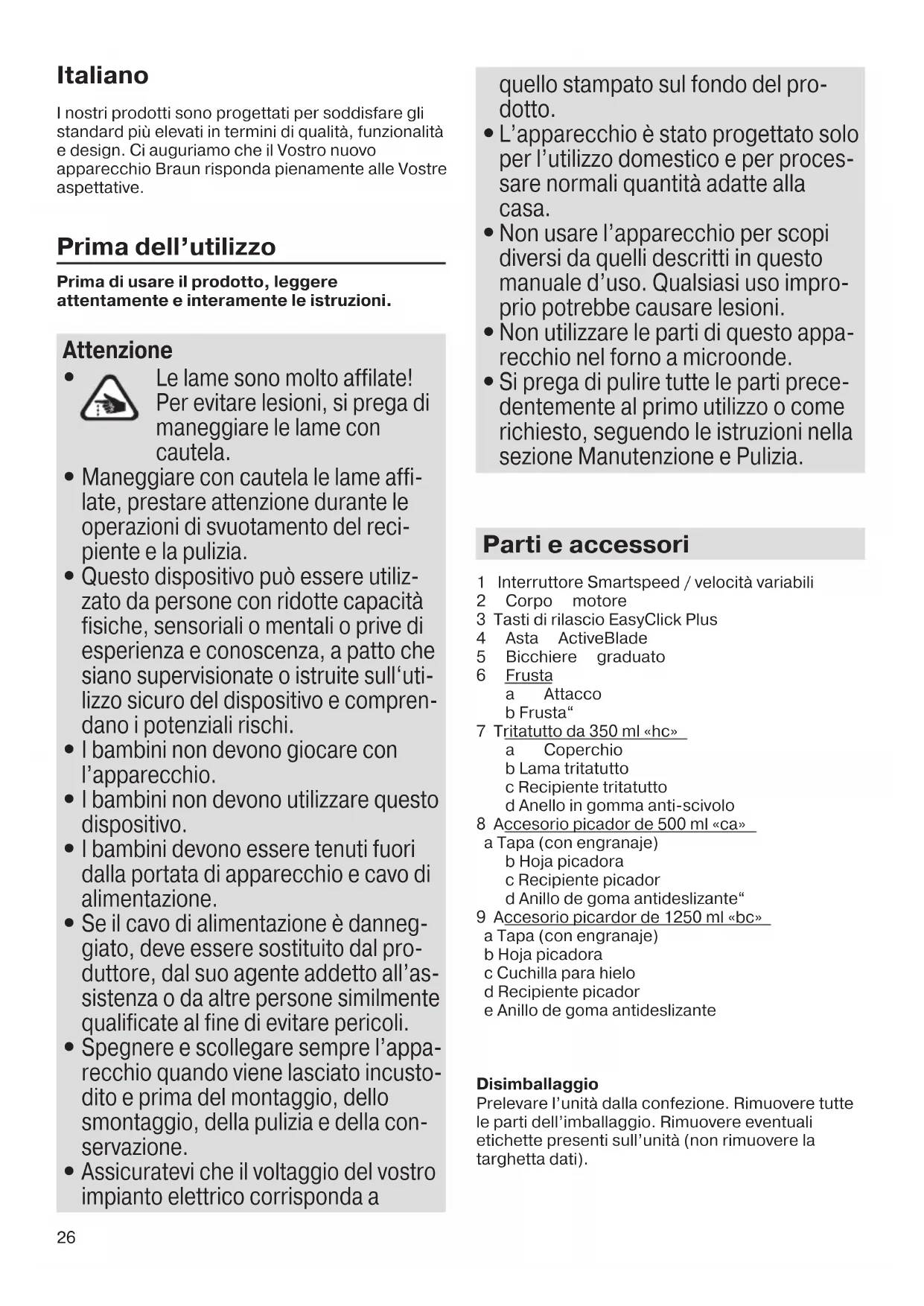 Maneggiare con cautela le lame affi- late, prestare attenzione durante le operazioni di svuotamento del reci- piente e la pulizia.