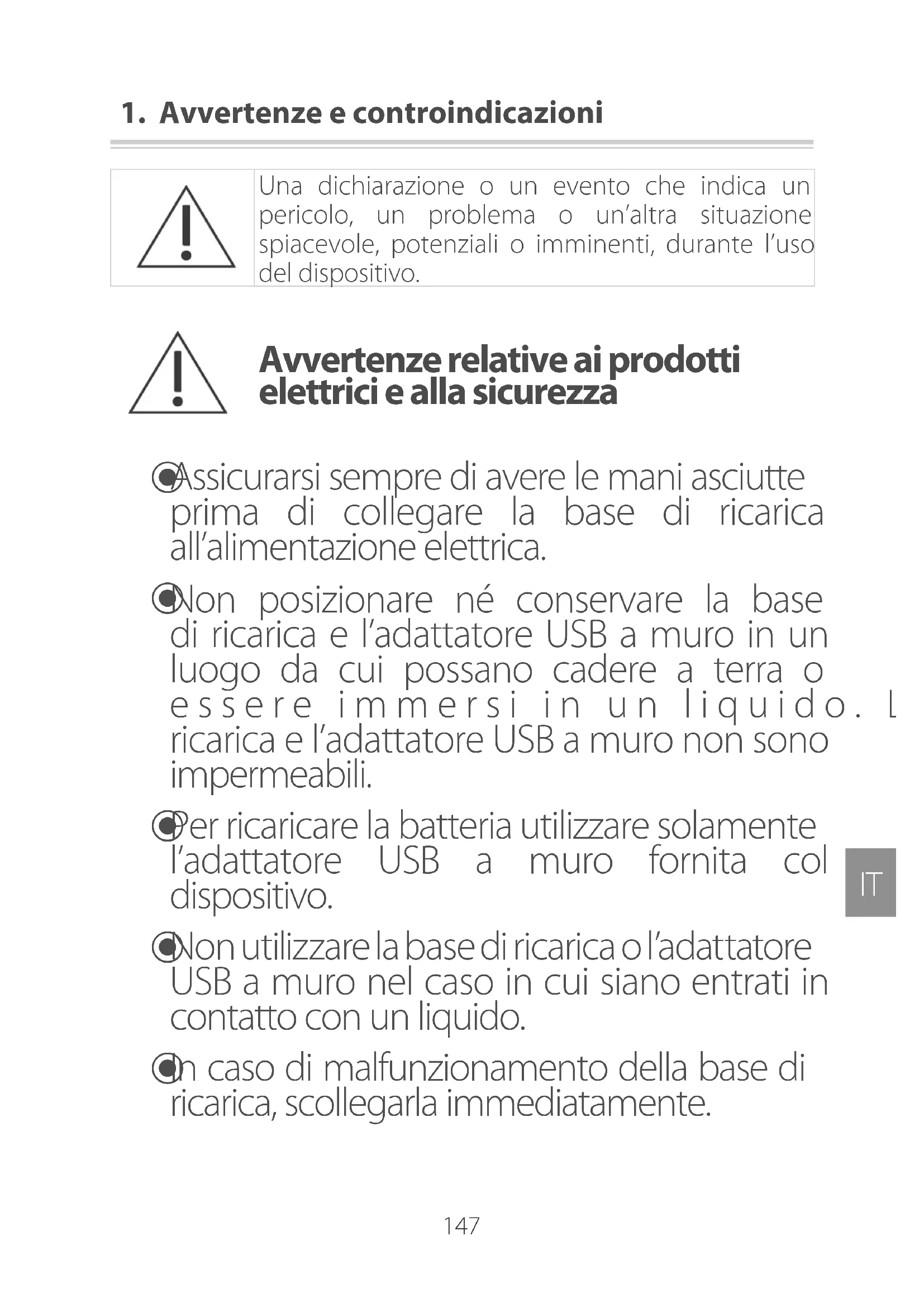 Non posizionare né conservare la base di ricarica e l'adattatore USB a muro in un luogo da cui possano cadere a terra o essere immersi in un liquido. L ricarica e l'adattatore USB a muro non sono impermeabili.