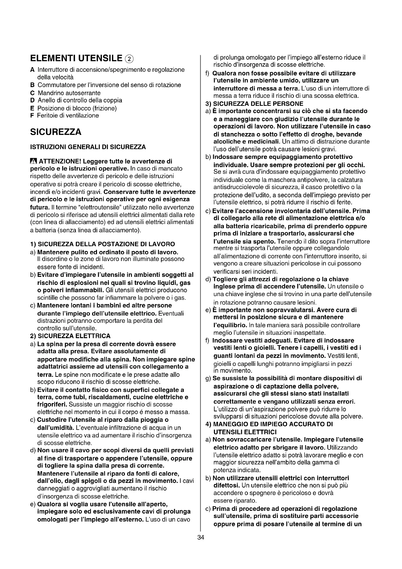- Leggete e conservate questo manuale di istruzione 3 CARATTERISTICHE TECNICHE 134 ELEMENTI UTENSILE 2 A Interruttore di accensione/spegnimento e regolazione della velocità B Commutatore per l’inversione del senso di rotazione C Mandrino autoserrante D Anello di controllo della coppia E Posizione di blocco (frizione) F Feritoie di ventilazione SICUREZZA