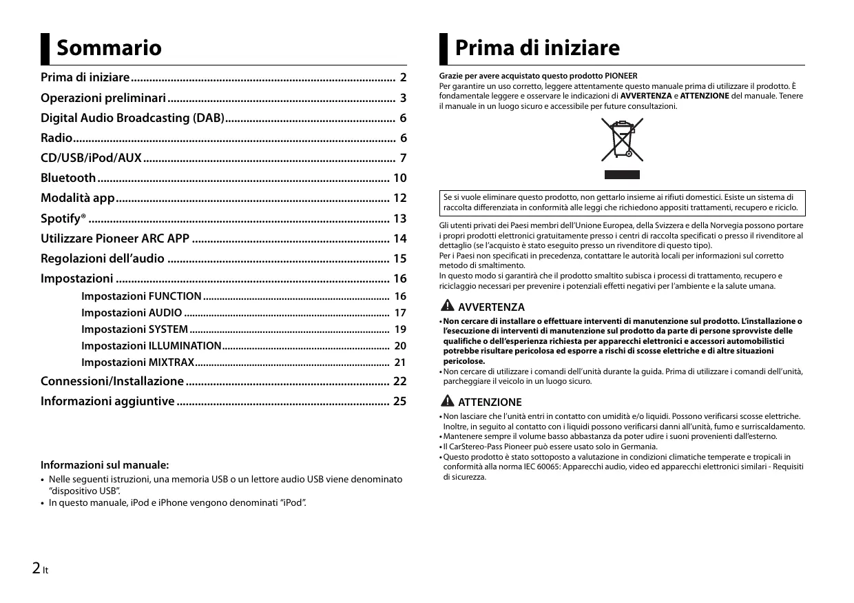 - In questo manuale, iPod e iPhone vengono denominati “iPod”. 2 It Se si vuole eliminare questo prodotto, non gettarlo insieme ai rifiuti domestici. Esiste un sistema di raccolta differenziata in conformità alle leggi che richiedono appositi trattamenti, recupero e riciclo. Gli utenti privati dei Paesi membri dell’Unione Europea, della Svizzera e della Norvegia possono portare i propri prodotti elettronici gratuitamente presso i centri di raccolta specificati o presso il rivenditore al dettaglio (se l’acquisto è stato eseguito presso un rivenditore di questo tipo). Per i Paesi non specificati in precedenza, contattare le autorità locali per informazioni sul corretto metodo di smaltimento. In questo modo si garantirà che il prodotto smaltito subisca i processi di trattamento, recupero e riciclaggio necessari per prevenire i potenziali effetti negativi per l’ambiente e la salute umana. AVVERTENZA
