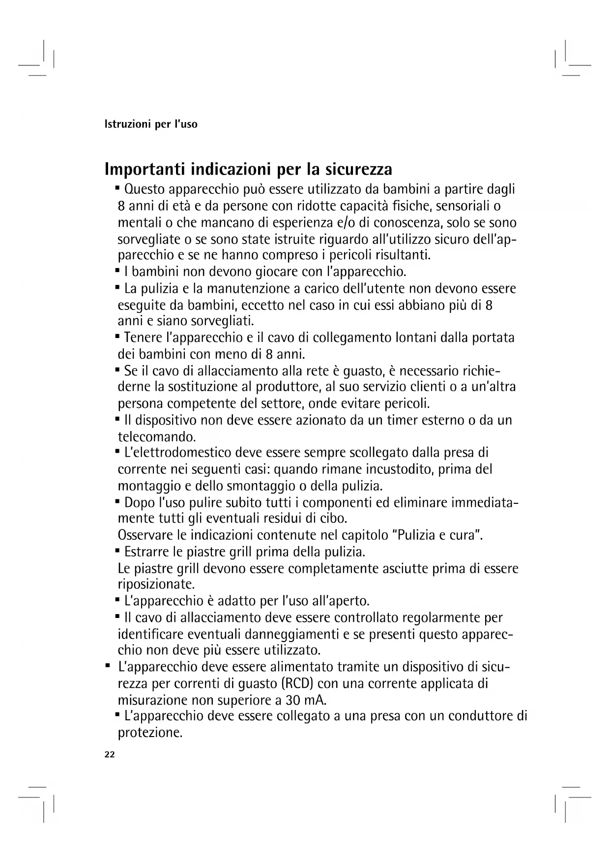 - La pulizia e la manutenzione a carico dell’utente non devono essere eseguite da bambini, eccetto nel caso in cui essi abbiano più di 8 anni e siano sorvegliati.