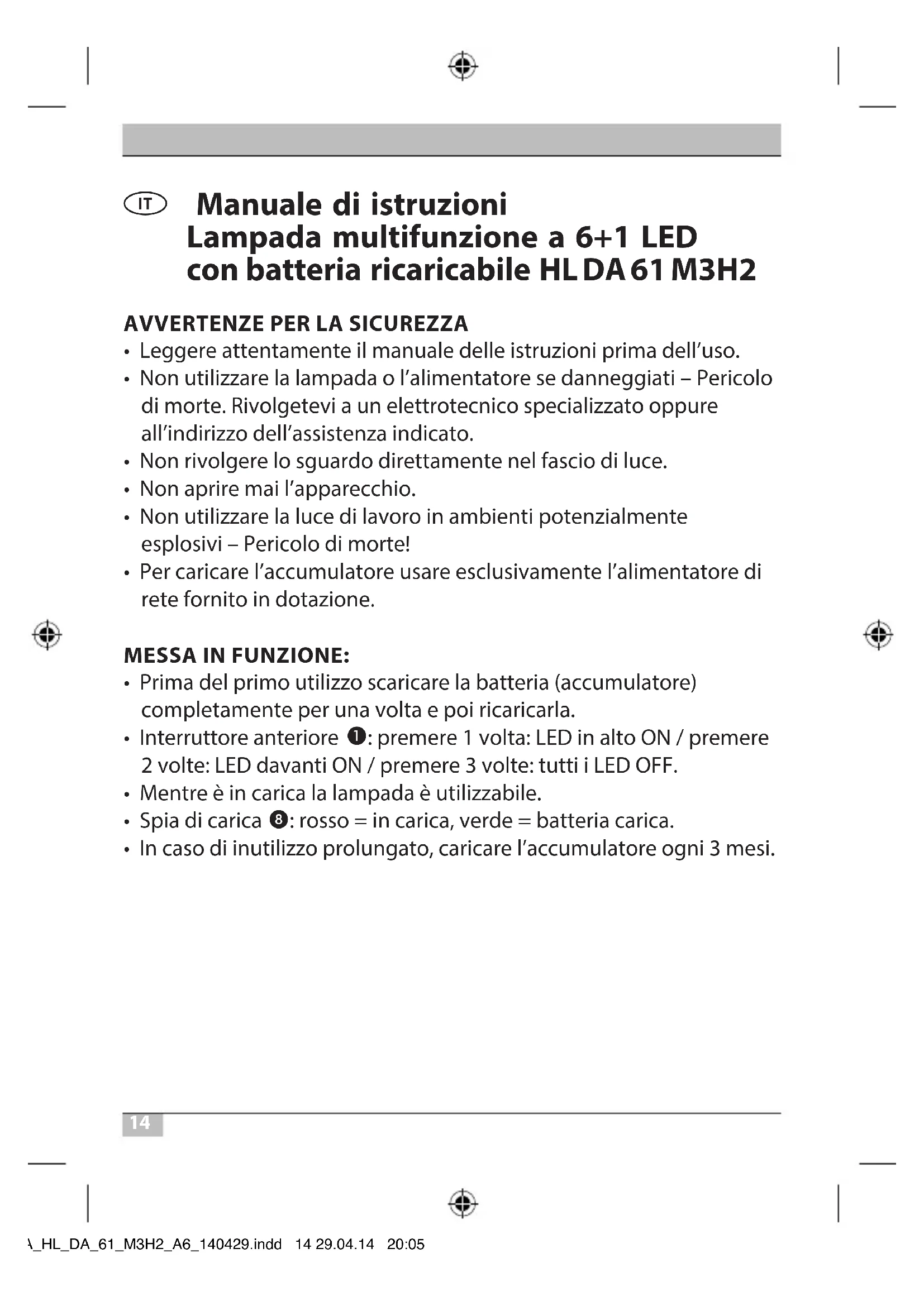 Manuale di istruzioni Lampada multifunzione a 6+1 LED conbatteria ricaricabile HL DA 61 M3H2