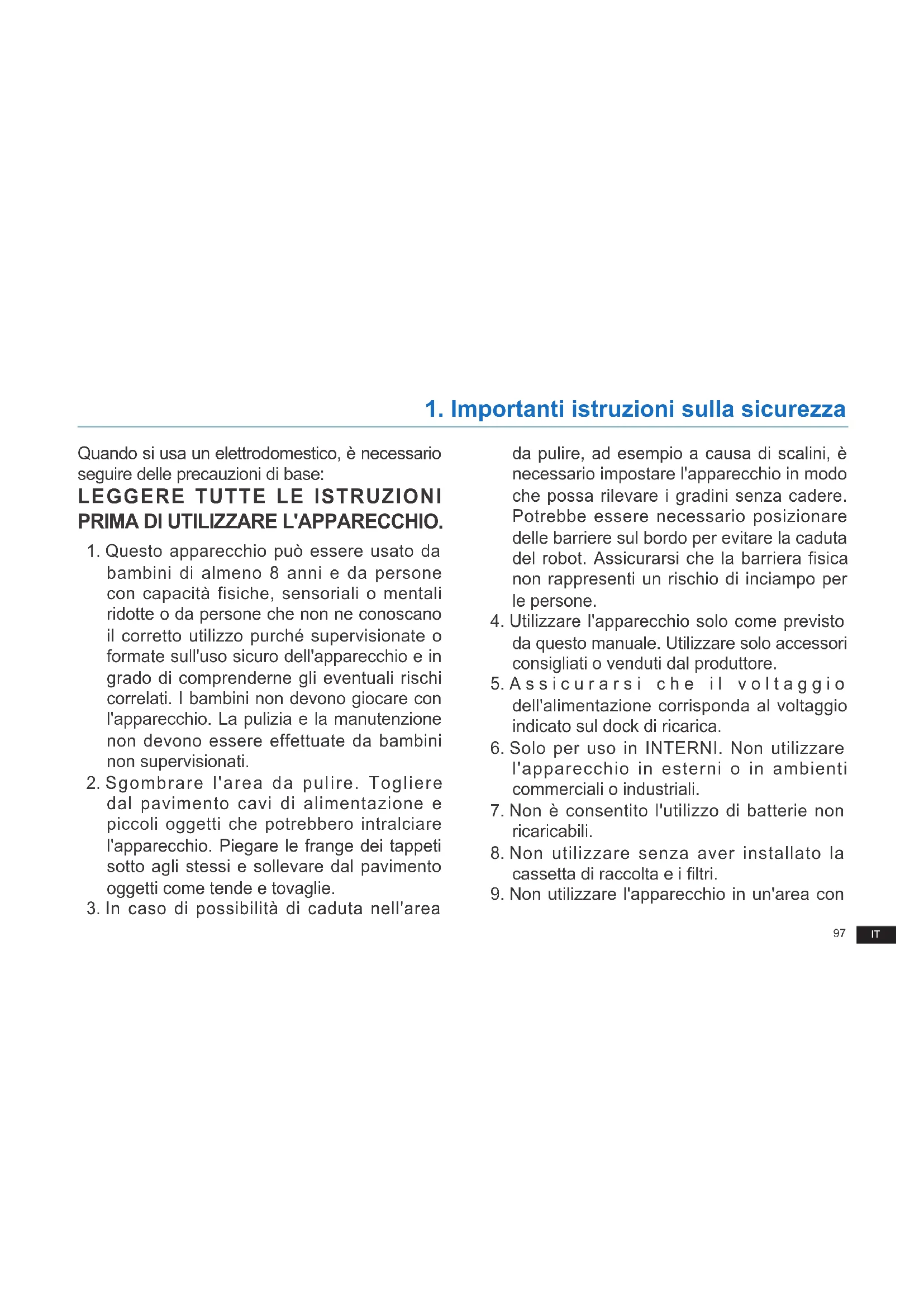 da pulire, ad esempio a causa di scalini, è necessario impostare l'apparecchio in modo che possa rilevare i gradini senza cadere. Potrebbe essere necessario posizionare delle barriere sul bordo per evitare la caduta del robot. Assicurarsi che la barriera fisica non rappresenti un rischio di inciampo per le persone.