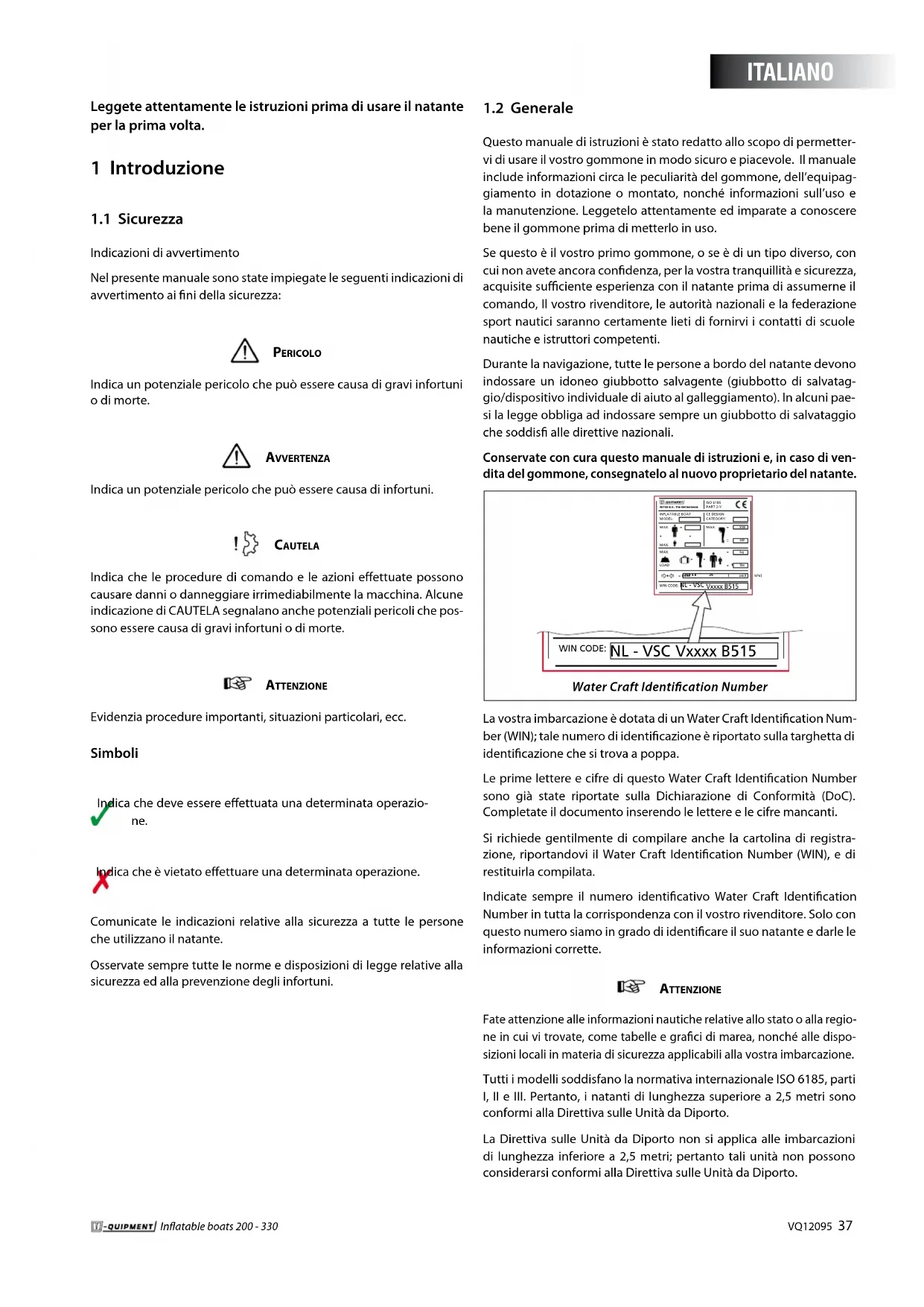 Questo manuale di istruzioni è stato redatto allo scopo di permetter- vi di usare il vostro gommone in modo sicuro e piacevole. Il manuale include informazioni circa le peculiarità del gommone, dell’equipag- giamento in dotazione o montato, nonché informazioni sull’uso e la manutenzione. Leggetelo attentamente ed imparate a conoscere bene il gommone prima di metterlo in uso. Se questo è il vostro primo gommone, o se è di un tipo diverso, con cui non avete ancora condenza, per la vostra tranquillità e sicurezza, acquisite suciente esperienza con il natante prima di assumerne il comando, Il vostro rivenditore, le autorità nazionali e la federazione sport nautici saranno certamente lieti di fornirvi i contatti di scuole nautiche e istruttori competenti. Durante la navigazione, tutte le persone a bordo del natante devono indossare un idoneo giubbotto salvagente (giubbotto di salvatag- gio/dispositivo individuale di aiuto al galleggiamento). In alcuni pae- si la legge obbliga ad indossare sempre un giubbotto di salvataggio che soddis alle direttive nazionali. Conservate con cura questo manuale di istruzioni e, in caso di ven- dita del gommone, consegnatelo al nuovo proprietario del natante. ITALIANO38 VQ12095 Inatable boats 200- 330