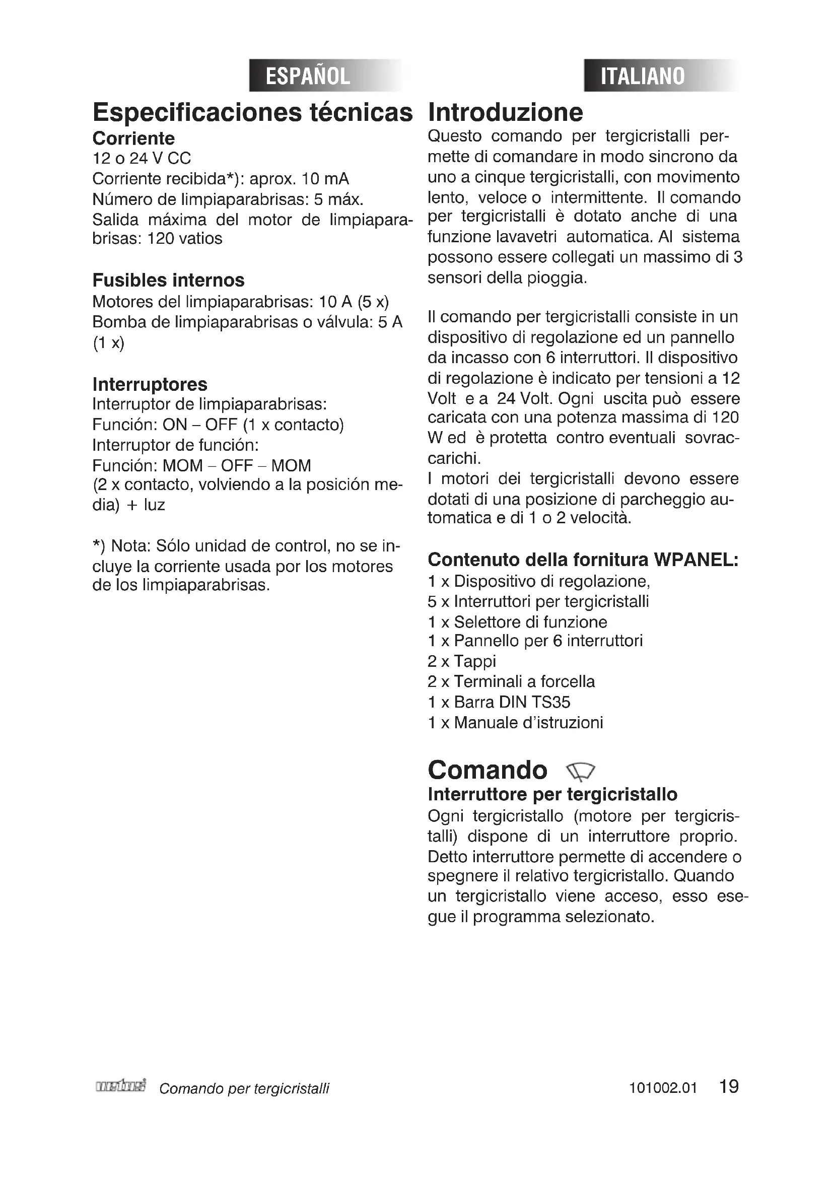 STATUS101002.01 21 Comando per tergicristalli Installazione Dispositivo di regolazione Posizionate il dispositivo di regolazione preferibilmente il più vicino possibile ai motori dei tergicristalli. In questo modo i cavi che lo collegano ai motori saranno corti. Montate il dispositivo di regolazione su una barra DIN TS35 (vedi pag. 27) Interruttori Montate gli interruttori in una posizione tale che l’utilizzatore possa facilmente ac- cedervi. Installate il selettore di funzione ed un (1) interruttore acceso-spento per ciascun motore per tergicristalli. Gli inter- ruttori sono a tenuta stagna e dotati di gu- arnizione. Gli interruttori possono essere installati di- rettamente su un pannello di strumentazi- one; in alternativa è possibile utilizzare il pannello ad incasso in dotazione. Se non è necessario montare tutti gli interruttori sul pannello da incasso, i fori che rimangono liberi possono essere chiusi con i tappi in dotazione. I pannelli da incasso non sono provvisti di guarnizione. Con l’aiuto della sagoma in dotazione, praticate un foro nel panello degli strumenti. Collegamenti Per lo schema di collegamento si rimanda a pag. 24. Tensione di alimentazione Il comando per tergicristalli è adatto a ten- sioni di corrente continua di 12 Volt e di 24 Volt. La tensione di funzionamento dei motori dei tergicristalli deve cor- rispondere alla tensione di bordo (12 Volt o 24 Volt). Il cavo positivo del dispositivo di regolazi- one deve essere dotato di un interruttore ed un fusibile. Eventualmente inserite un fusibile con amperaggio inferiore, ade- guato alla corrente massima totale dei 5 motori dei tergicristalli. Usate cavi con una sezione sufficientemente grande. Vedi schema di collegamento per sezione mi- nima raccomandata dei cavi. Collegate la tensione di alimentazione con i terminali in dotazione (ø 5 mm). Motori per tergicristalli Installate unicamente motori per tergicristalli dello stesso tipo e dotati di una posizione di parcheg- gio automatica. Per potere utilizzare sia la funzione a bas- sa velocità, sia quella ad alta velocità, è necessario che i motori per tergicristalli dispongano di 2 velocità. Per esempio il motore Vetus tipo RWS e HDMC. Il motore Vetus tipo ORW non è indicato. Collegate il motore per tergicristalli al dispositivo di regolazione, come indicato nello schema. Usate cavi con una sezione sufficientemente grande. Vedi schema di collegamento per cavi di sezione racco- mandata a pagina 24.). Interruttori Collegate gli interruttori al dispositivo di regolazione, come indicato nello schema. Usate cavi con sezione uguale a quella indicata. ITALIANO22 101002.01 Comando per tergicristalli Lavavetri Per l’installazione di un lavavetri è pos- sibile collegare una pompa dell’acqua o una valvola magnetica al connettore “WASHER”. La tensione di funzionamento del- la pompa o della valvola magneti- ca deve corrispondere alla tensi- one di bordo (12 Volt o 24 Volt). Sensori della pioggia Per l’installazione dei sensori della pioggia si rimanda alle istruzioni fornite insieme agli stessi. Sistemi di protezione Ogni motore per tergicristalli è dotato di un proprio fusibile. Anche la pompa lava- vetri è dotata di un proprio fusibile. I fusibili sono situati sotto il coperchio del dispositivo di regolazione (per rimuovere il coperchio fare riferimento alla seguente figura). Si rimanda ai paragrafo “Dati tecnici” per la sostituzione dei fusibili. Dati tecnici Tensione di alimentazione 12 Volt o 24 Volt corrente continua Assorbimento*): ca 10 mA Numero di tergicristalli: massimo 5 Potenza massima motore tergicristalli: 120 Watt Fusibili interni Motori per tergicristalli: 10 A (5 x ) Pompa lavavetri o valvola: 5 A (1 x ) Interruttori Interruttore per tergicristallo: Funzione: ON – OFF (1 x contatto di lavoro) Selettore di funzione: Funzione: MOM – OFF – MOM (2 x contatti di lavoro, con ritorno in posizi- one mediana) + lampadina *) N.B. Solo il dispositivo di regolazione, escluso l’assorbimento dei motori dei ter- gicristalli.101002.01 23 Windscreen wiper controller