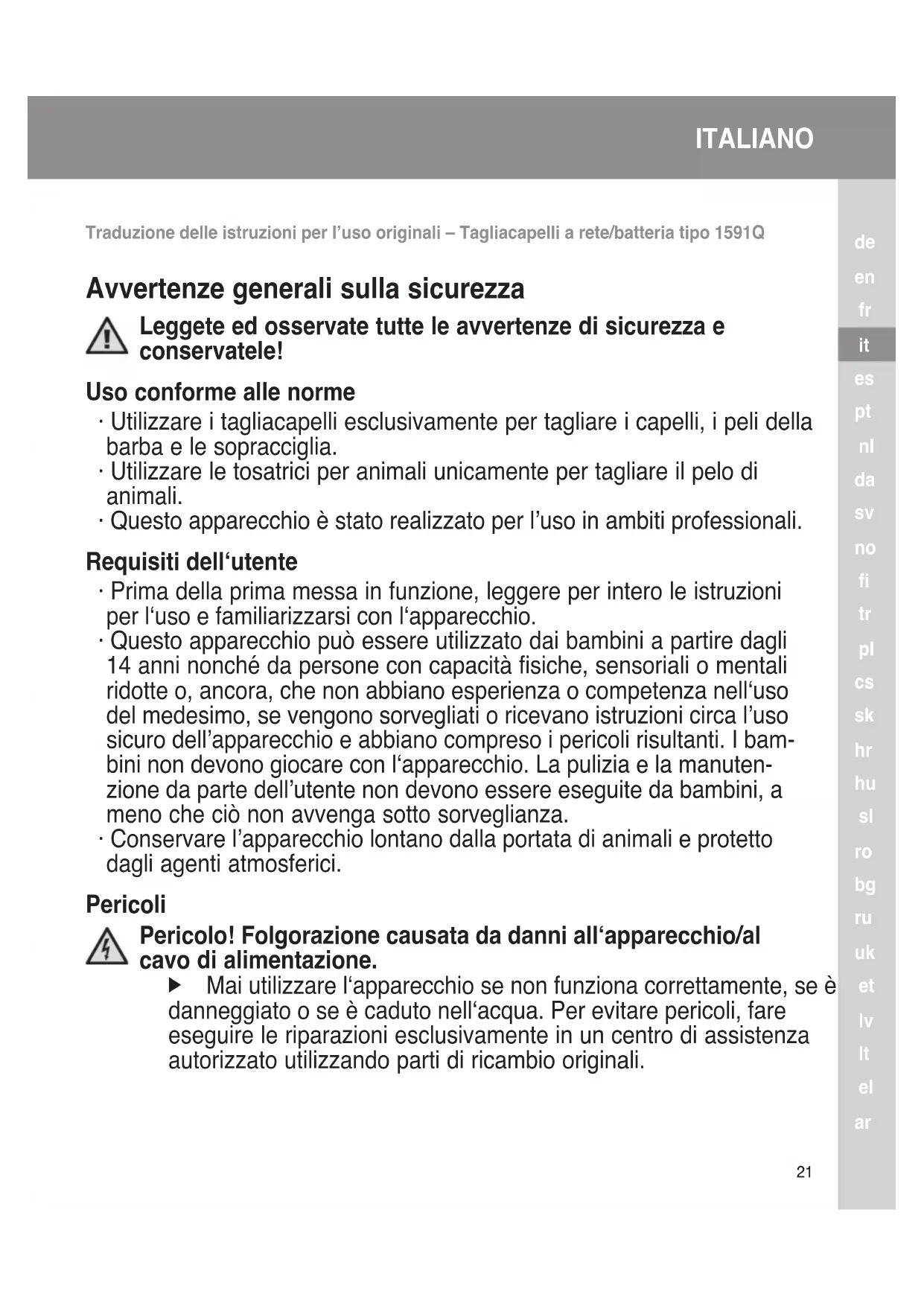 - Conservare l’apparecchio lontano dalla portata di animali e protetto dagli agenti atmosferici. Pericoli Pericolo! Folgorazione causata da danni all‘apparecchio/al cavo di alimentazione. f Mai utilizzare l‘apparecchio se non funziona correttamente, se è danneggiato o se è caduto nell‘acqua. Per evitare pericoli, fare eseguire le riparazioni esclusivamente in un centro di assistenza autorizzato utilizzando parti di ricambio originali. Traduzione delle istruzioni per l’uso originali – Tagliacapelli a rete/batteria tipo 1591QITALIANO