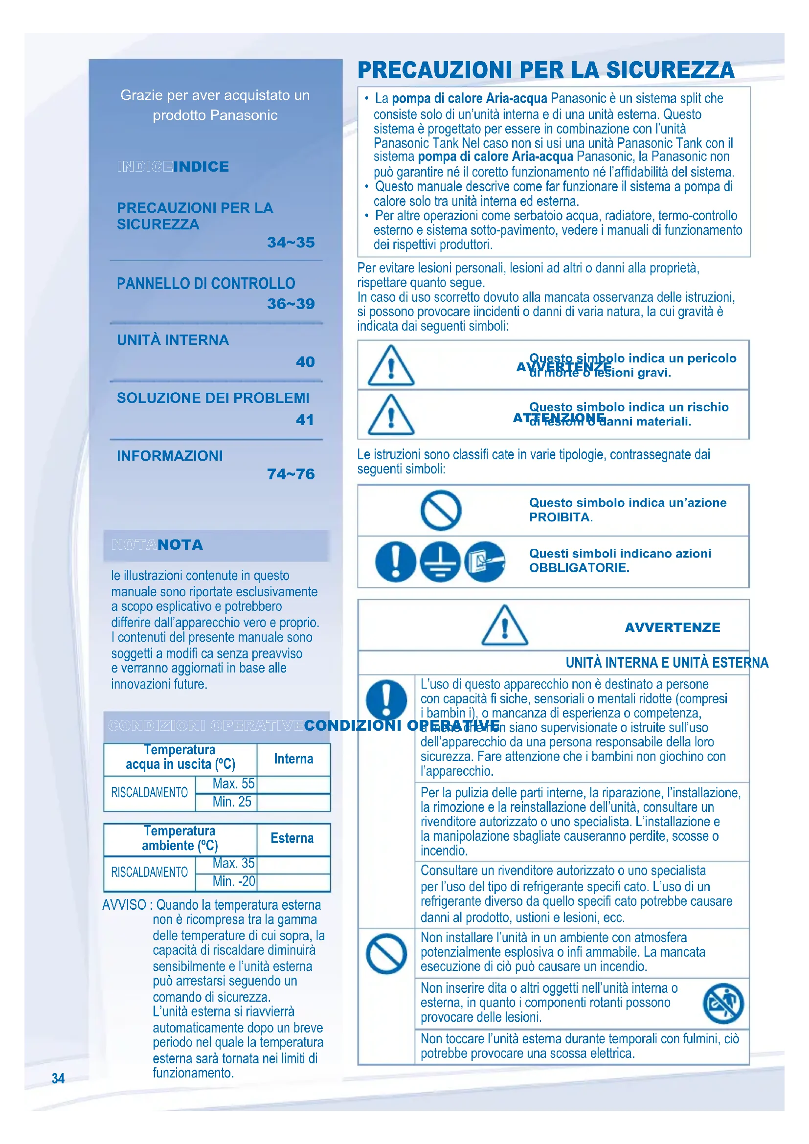 Temperatura acqua in uscita (ºC) Interna RISCALDAMENTO Max. 55 Min. 25 Temperatura ambiente (ºC) Esterna RISCALDAMENTO Max. 35 Min. -20 AVVISO : Quando la temperatura esterna non è ricompresa tra la gamma delle temperature di cui sopra, la capacità di riscaldare diminuirà sensibilmente e l’unità esterna può arrestarsi seguendo un comando di sicurezza. L’unità esterna si riavvierrà automaticamente dopo un breve periodo nel quale la temperatura esterna sarà tornata nei limiti di funzionamento. Per evitare lesioni personali, lesioni ad altri o danni alla proprietà, rispettare quanto segue. In caso di uso scorretto dovuto alla mancata osservanza delle istruzioni, si possono provocare iincidenti o danni di varia natura, la cui gravità è indicata dai seguenti simboli: AVVERTENZEAVVERTENZE Questo simbolo indica un pericolo di morte o lesioni gravi. ATTENZIONEATTENZIONE Questo simbolo indica un rischio di lesioni o danni materiali. Le istruzioni sono classifi cate in varie tipologie, contrassegnate dai seguenti simboli: Questo simbolo indica un’azione PROIBITA. Questi simboli indicano azioni OBBLIGATORIE. AVVERTENZEAVVERTENZE UNITÀ INTERNA E UNITÀ ESTERNAUNITÀ INTERNA E UNITÀ ESTERNA L’uso di questo apparecchio non è destinato a persone con capacità fi siche, sensoriali o mentali ridotte (compresi i bambin i), o mancanza di esperienza o competenza, a meno che non siano supervisionate o istruite sull’uso dell’apparecchio da una persona responsabile della loro sicurezza. Fare attenzione che i bambini non giochino con l’apparecchio. Per la pulizia delle parti interne, la riparazione, l’installazione, la rimozione e la reinstallazione dell’unità, consultare un rivenditore autorizzato o uno specialista. L’installazione e la manipolazione sbagliate causeranno perdite, scosse o incendio. Consultare un rivenditore autorizzato o uno specialista per l’uso del tipo di refrigerante specifi cato. L’uso di un refrigerante diverso da quello specifi cato potrebbe causare danni al prodotto, ustioni e lesioni, ecc. Non installare l’unità in un ambiente con atmosfera potenzialmente esplosiva o infi ammabile. La mancata esecuzione di ciò può causare un incendio. Non inserire dita o altri oggetti nell’unità interna o esterna, in quanto i componenti rotanti possono provocare delle lesioni. Non toccare l’unità esterna durante temporali con fulmini, ciò potrebbe provocare una scossa elettrica.