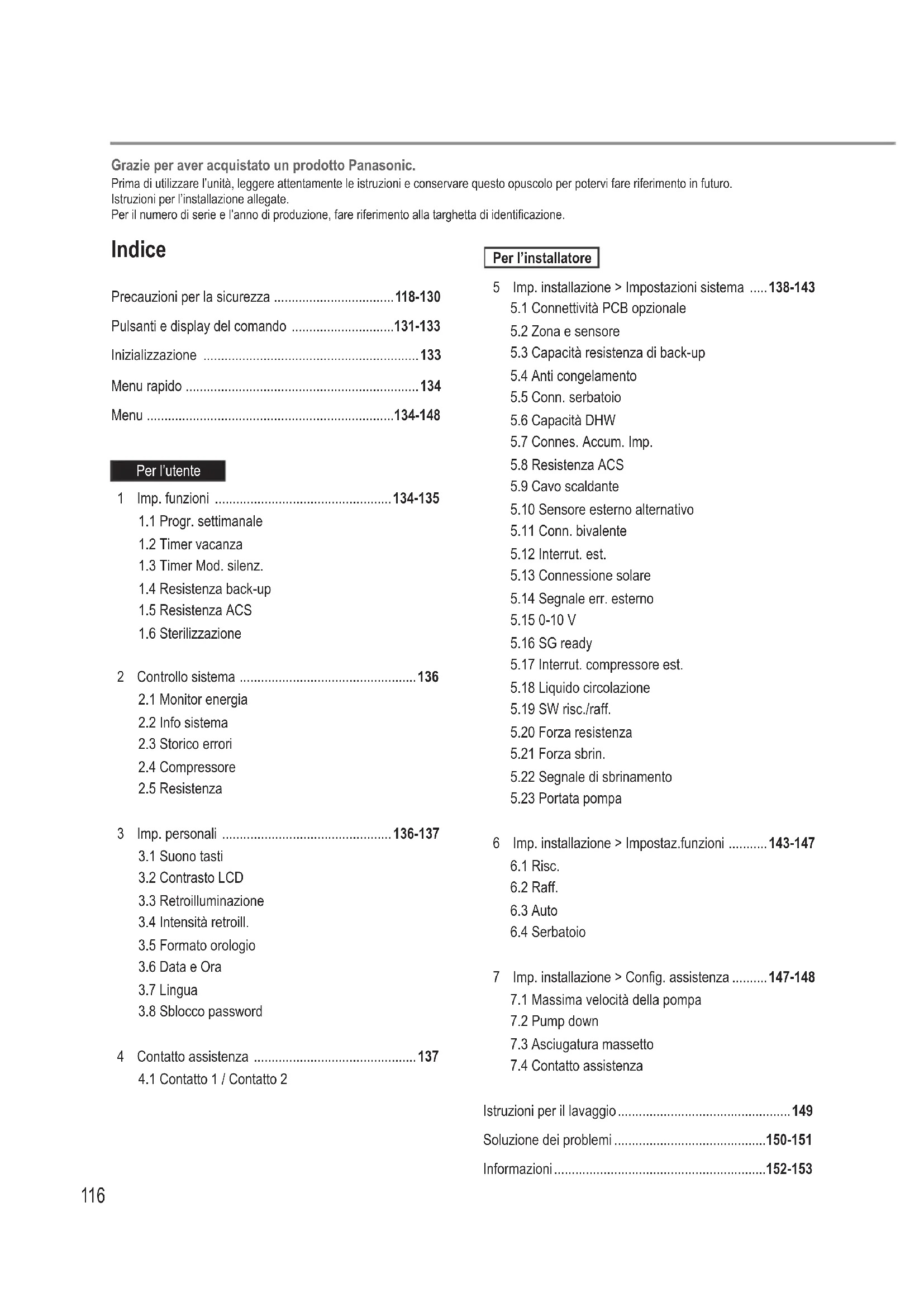 Istruzioni per il lavaggio .................................................149 Soluzione dei problemi ...........................................150-151 Informazioni ............................................................152-153 Grazie per aver acquistato un prodotto Panasonic. Prima di utilizzare l’unità, leggere attentamente le istruzioni e conservare questo opuscolo per potervi fare riferimento in futuro. Istruzioni per l’installazione allegate. Per il numero di serie e l’anno di produzione, fare riferimento alla targhetta di identicazione.IT Prima dell’uso, assicurarsi che il sistema sia stato installato correttamente da un rivenditore autorizzato in base alle istruzioni fornite.