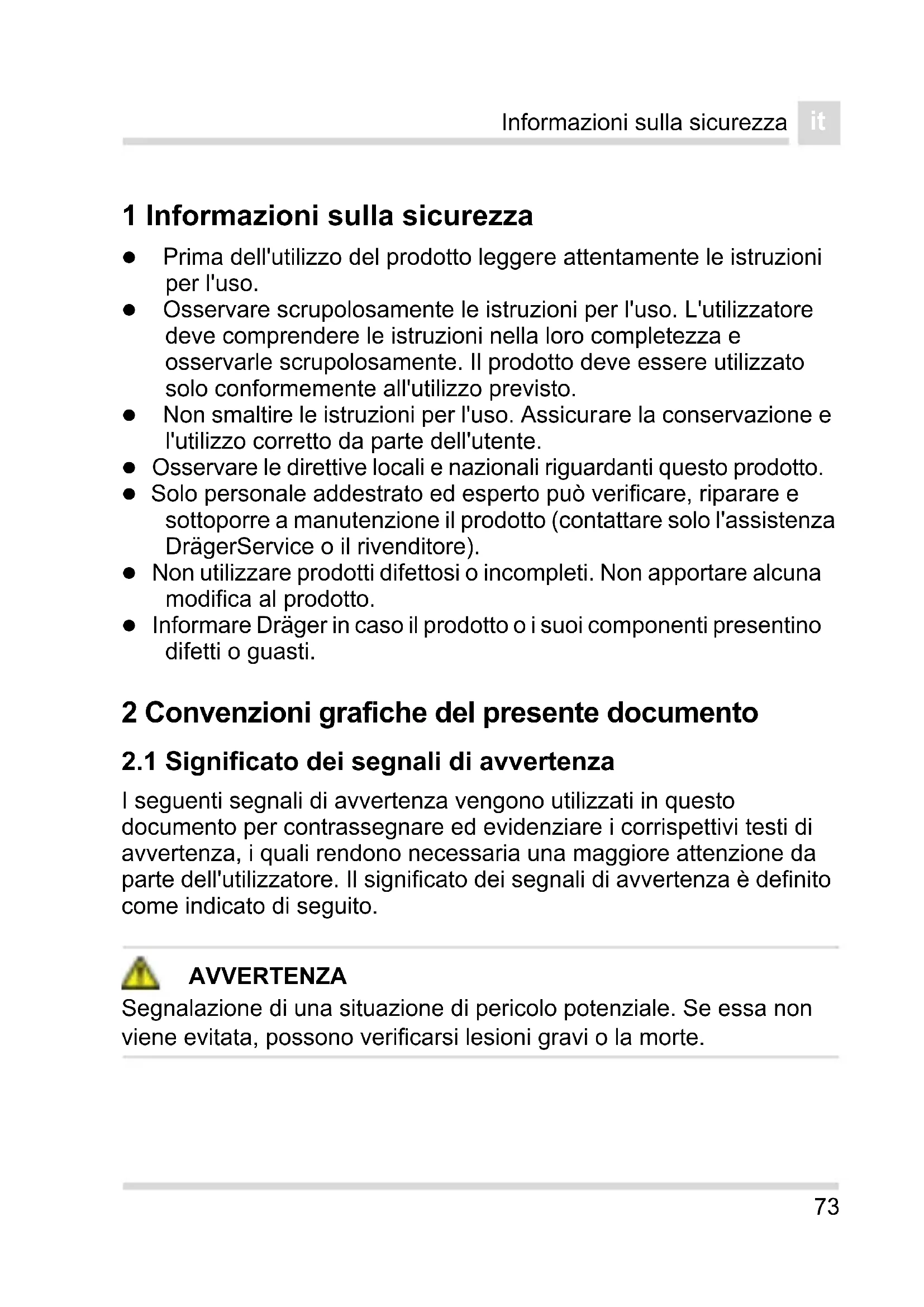 1 Informazioni sulla sicurezza Prima dell'utilizzo del prodotto leggere attentamente le istruzioni per l'uso. Osservare scrupolosamente le istruzioni per l'uso. L'utilizzatore deve comprendere le istruzioni nella loro completezza e osservarle scrupolosamente. Il prodotto deve essere utilizzato solo conformemente all'utilizzo previsto. Non smaltire le istruzioni per l'uso. Assicurare la conservazione e l'utilizzo corretto da parte dell'utente. Osservare le direttive locali e nazionali riguardanti questo prodotto. Solo personale addestrato ed esperto può verificare, riparare e sottoporre a manutenzione il prodotto (contattare solo l'assistenza DrägerService o il rivenditore). Non utilizzare prodotti difettosi o incompleti. Non apportare alcuna modifica al prodotto. Informare Dräger in caso il prodotto o i suoi componenti presentino difetti o guasti. 2 Convenzioni grafiche del presente documento