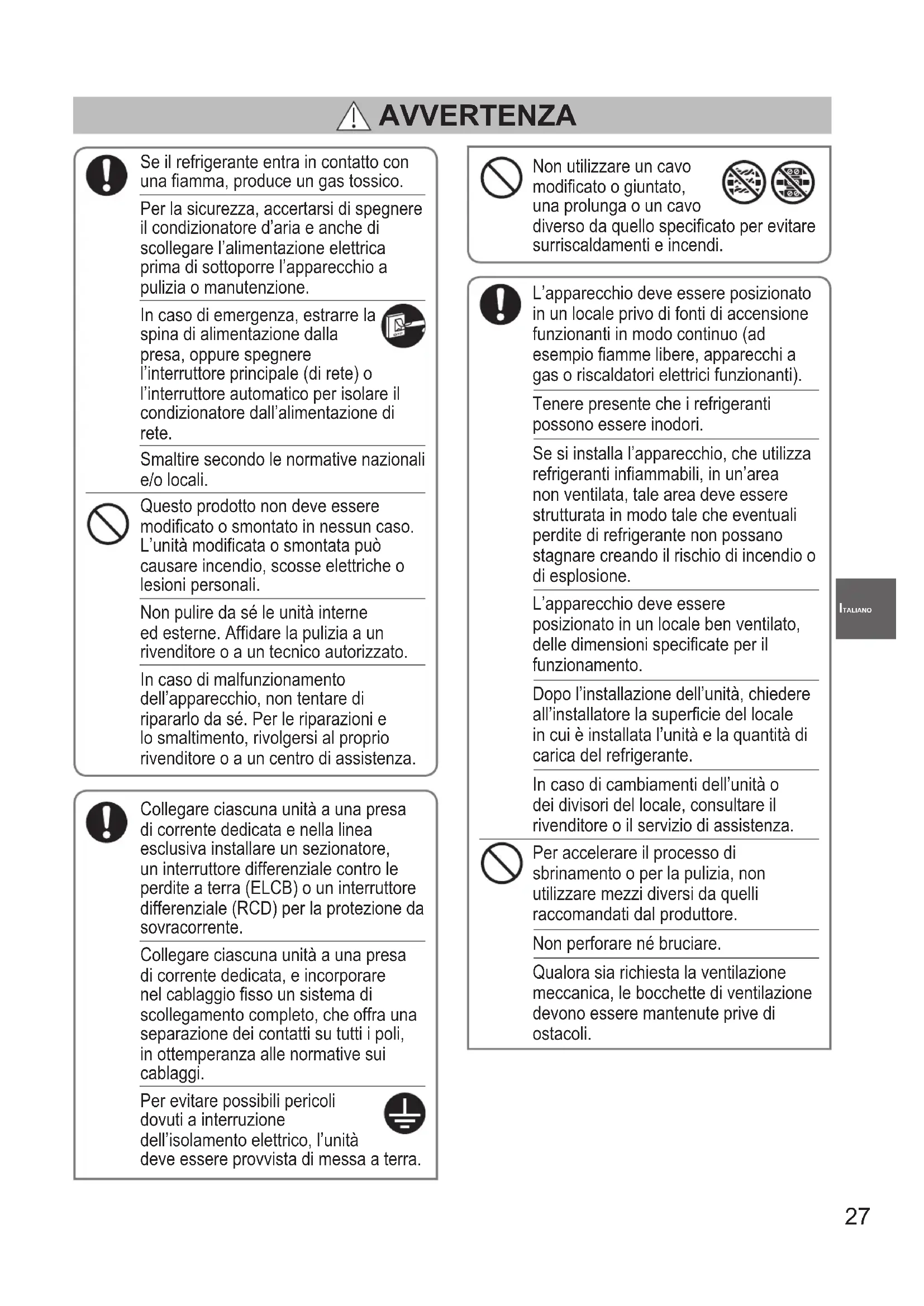 - Laventolanonsifermaneanchese sispegnel’apparecchio. Contattareimmediatamente ilrivenditorelocaleperla manutenzione/riparazione. AVVERTENZA L’apparecchiodeveessere posizionatoinunlocaleprivodi ammeliberefunzionantiinmodo continuo(adesempioapparecchia gasfunzionanti)efontidiaccensione (adesempioriscaldatorielettrici funzionanti). OI_00_310300_all.indb 28 2018/12/20 11:07:2129 ITALIANO Precauzioni per l’uso Installazione