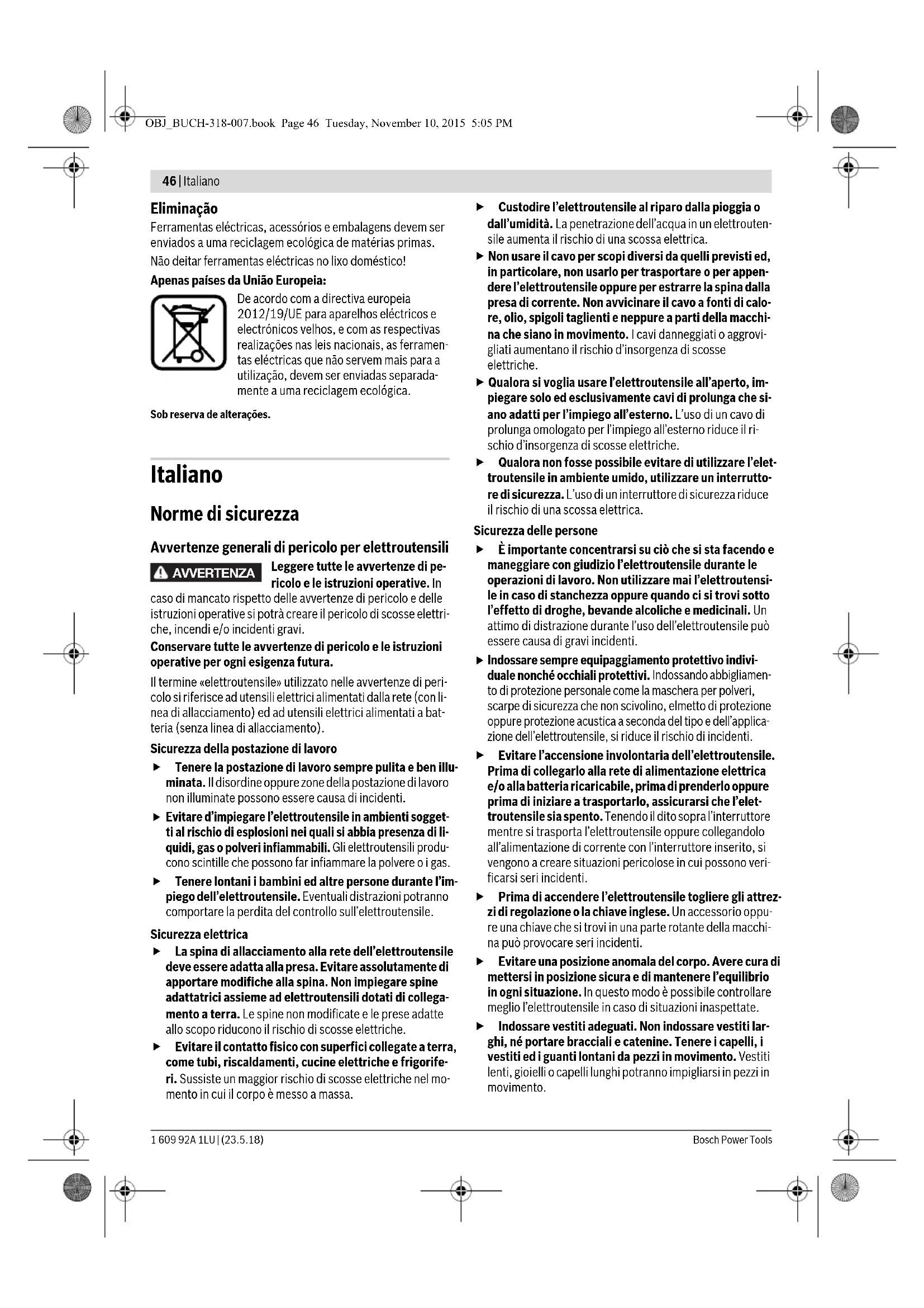 Indossare sempre equipaggiamento protettivo indivi- duale nonché occhiali protettivi. Indossando abbigliamen- to di protezione personale come la maschera per polveri, scarpe di sicurezza che non scivolino, elmetto di protezione oppure protezione acustica a seconda del tipo e dell’applica- zione dell’elettroutensile, si riduce il rischio di incidenti. Evitare l’accensione involontaria dell’elettroutensile. Prima di collegarlo alla rete di alimentazione elettrica e/o alla batteria ricaricabile, prima di prenderlo oppure prima di iniziare a trasportarlo, assicurarsi che l’elet- troutensile sia spento. Tenendo il dito sopra l’interruttore mentre si trasporta l’elettroutensile oppure collegandolo all’alimentazione di corrente con l’interruttore inserito, si vengono a creare situazioni pericolose in cui possono veri- ficarsi seri incidenti. Prima di accendere l’elettroutensile togliere gli attrez- zi di regolazione o la chiave inglese. Un accessorio oppu- re una chiave che si trovi in una parte rotante della macchi- na può provocare seri incidenti. Evitare una posizione anomala del corpo. Avere cura di mettersi in posizione sicura e di mantenere l’equilibrio in ogni situazione. In questo modo è possibile controllare meglio l’elettroutensile in caso di situazioni inaspettate. Indossare vestiti adeguati. Non indossare vestiti lar- ghi, né portare bracciali e catenine. Tenere i capelli, i vestiti ed i guanti lontani da pezzi in movimento. Vestiti lenti, gioielli o capelli lunghi potranno impigliarsi in pezzi in movimento. AVVERTENZA OBJ_BUCH-318-007.book Page 46 Tuesday, November 10, 2015 5:05 PMItaliano | 47 Bosch Power Tools 1 609 92A 1LU | (23.5.18) In caso fosse previsto il montaggio di dispositivi di aspirazione della polvere e di raccolta, assicurarsi che gli stessi siano collegati e che vengano utilizzati corret- tamente. L’utilizzo di un’aspirazione polvere può ridurre lo svilupparsi di situazioni pericolose dovute alla polvere. Trattamento accurato ed uso corretto degli elettroutensili Non sottoporre la macchina a sovraccarico. Per il pro- prio lavoro, utilizzare esclusivamente l’elettroutensile esplicitamente previsto per il caso. Con un elettrouten- sile adatto si lavora in modo migliore e più sicuro nell’ambi- to della sua potenza di prestazione. Non utilizzare mai elettroutensili con interruttori difet- tosi. Un elettroutensile con l’interruttore rotto è pericoloso e deve essere aggiustato. Prima di procedere ad operazioni di regolazione sulla macchina, prima di sostituire parti accessorie oppure prima di posare la macchina al termine di un lavoro, estrarre sempre la spina dalla presa della corrente e/o estrarre la batteria ricaricabile. Tale precauzione eviterà che l’elettroutensile possa essere messo in funzione invo- lontariamente.