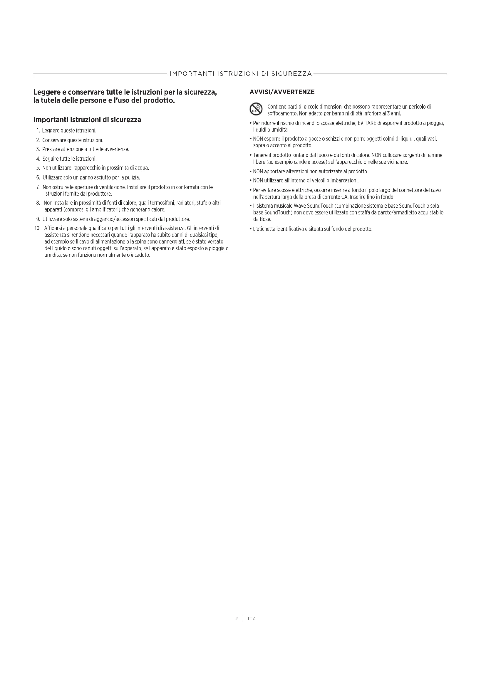 Windows è un marchio registrato di Microsoft Corporation negli Stati Uniti e in altri Paesi. Bose, SoundTouch, il disegno della nota wireless, Wave e il design caratteristico del sistema musicale Wave sono marchi registrati di Bose Corporation. Sede principale di Bose Corporation: 1-877-230-5639 © 2018 Bose Corporation. Nessuna parte di questo documento può essere riprodotta, modificata, distribuita o usata in altro modo senza previa autorizzazione scritta.SOMMARIO
