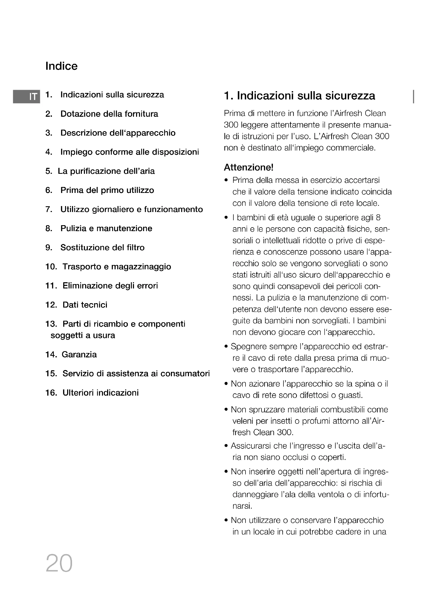 Prima di mettere in funzione l’Airfresh Clean 300 leggere attentamente il presente manua- le di istruzioni per l’uso. L’Airfresh Clean 300 non è destinato all‘impiego commerciale. Attenzione!