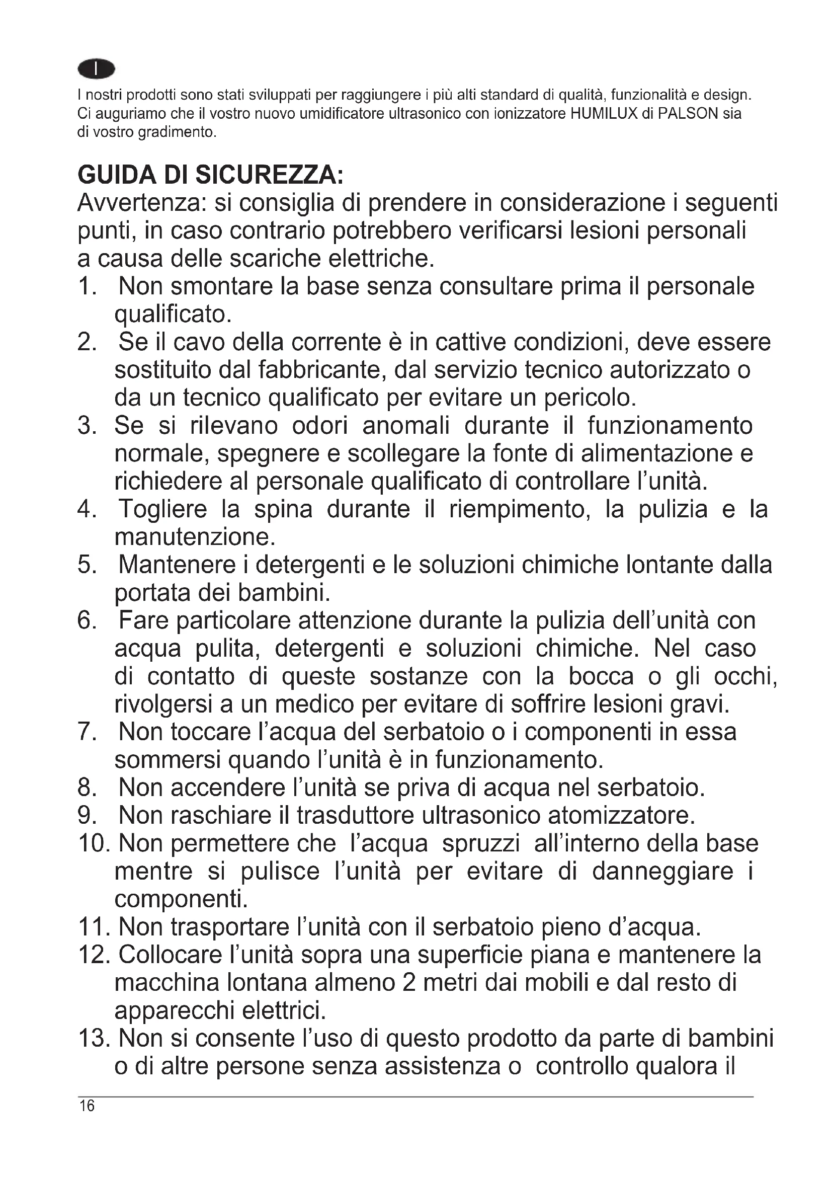 Scarica le istruzioni per il tuo Umidificatore in formato PDF gratuitamente! Trova il tuo manuale Humilux 30542 - PALSON e riprendi in mano il tuo dispositivo elettronico. In questa pagina sono pubblicati tutti i documenti necessari per l'utilizzo del tuo dispositivo. Humilux 30542 del marchio PALSON.