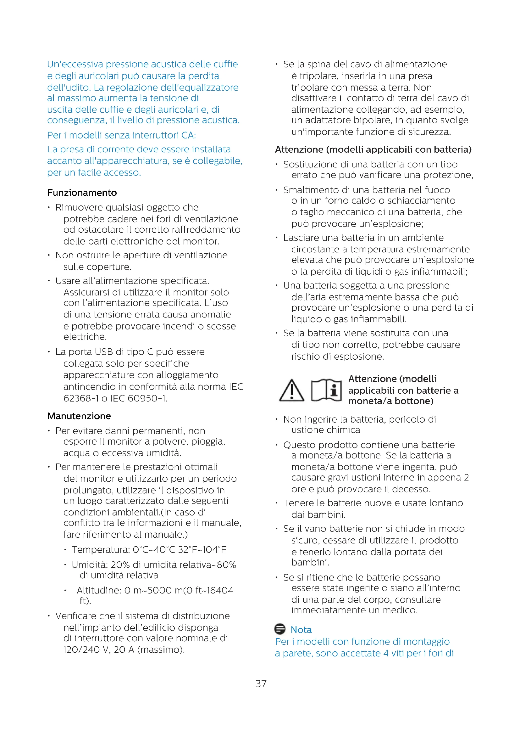 - Se la batteria viene sostituita con una di tipo non corretto, potrebbe causare rischio di esplosione. Attenzione (modelli applicabili con batterie a moneta/a bottone)