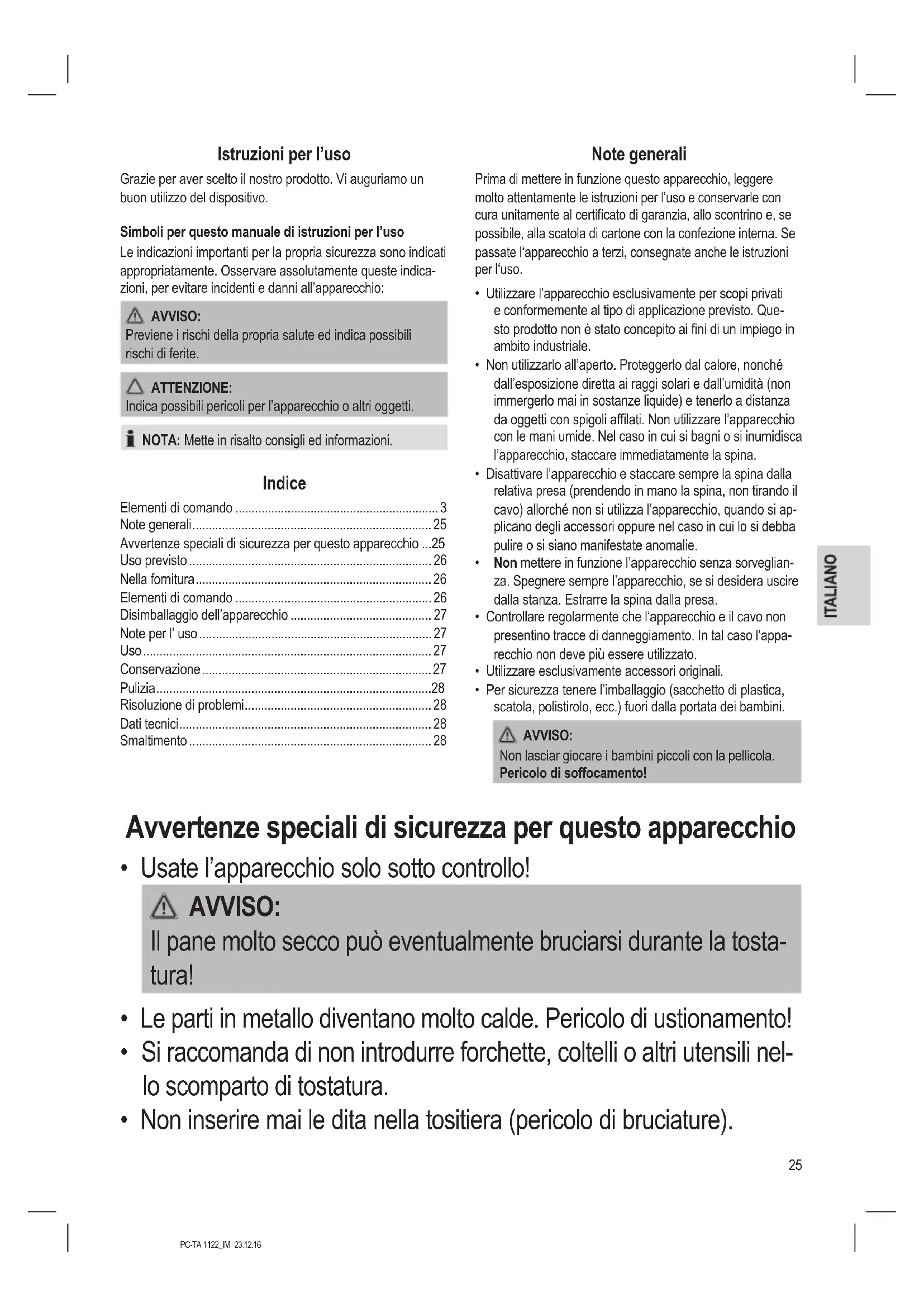 - Non inserire mai le dita nella tositiera (pericolo di bruciature).26 PC-TA 1122_IM 23.12.16