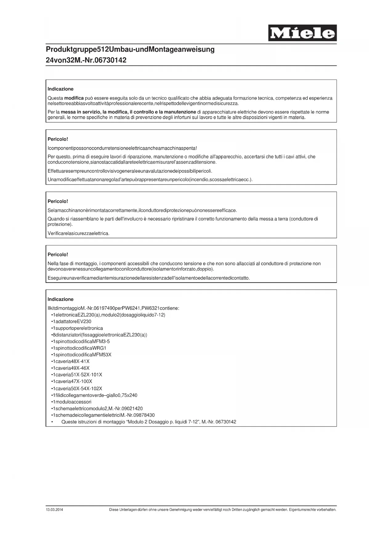 Numero N. d'ord. Denominazione 1 06252200 Kit di montaggio “MF03 Modulo multifunzione PW6241-6321” oppure 1 09885160 Kit di montaggio “MF03 24-32 kg Modulo multifunzione USA” Produktgruppe 512 Umbau- und Montageanweisung 23 von 32 M.-Nr. 06730142 13.03.2014 Diese Unterlagen dürfen ohne unsere Genehmigung weder vervielfältigt noch Dritten zugänglich gemacht werden. Eigentumsrechte vorbehalten.Indicazione Questa modifica può essere eseguita solo da un tecnico qualificato che abbia adeguata formazione tecnica, competenza ed esperienza nel settore e abbia svolto attività professionale recente, nel rispetto delle vigenti norme di sicurezza. Per la messa in servizio, la modifica, il controllo e la manutenzione di apparecchiature elettriche devono essere rispettate le norme generali, le norme specifiche in materia di prevenzione degli infortuni sul lavoro e tutte le altre disposizioni vigenti in materia. Pericolo! I componenti possono condurre tensione elettrica anche a macchina spenta! Per questo, prima di eseguire lavori di riparazione, manutenzione o modifiche all'apparecchio, accertarsi che tutti i cavi attivi, che conducono tensione, siano staccati dalla rete elettrica e misurare l'assenza di tensione. Effettuare sempre un controllo visivo generale e una valutazione dei possibili pericoli. Una modifica effettuata non a regola d'arte può rappresentare un pericolo (incendio, scossa elettrica ecc.). Pericolo! Se la macchina non è rimontata correttamente, il conduttore di protezione può non essere efficace. Quando si riassemblano le parti dell'involucro è necessario ripristinare il corretto funzionamento della messa a terra (conduttore di protezione). Verificare la sicurezza elettrica. Pericolo! Nella fase di montaggio, i componenti accessibili che conducono tensione e che non sono allacciati al conduttore di protezione non devono avere nessun collegamento con il conduttore (isolamento rinforzato, doppio). Eseguire una verifica mediante misurazione della resistenza dell'isolamento e della corrente di contatto. Indicazione Il kit di montaggio M.-Nr. 06197490 per PW 6241, PW 6321 contiene: