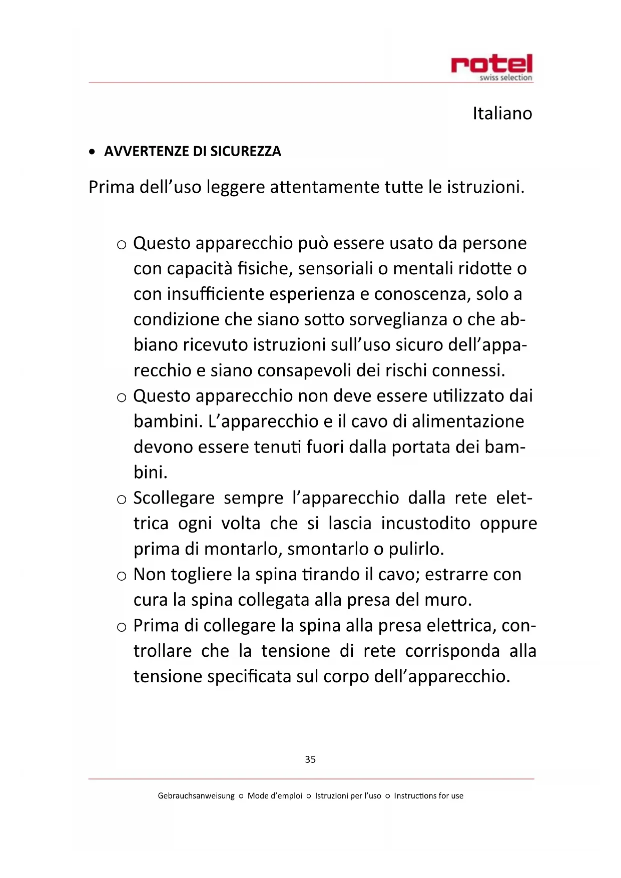 Prima dell’uso leggere attentamente tutte le istruzioni. o Questo apparecchio può essere usato da persone con capacità fisiche, sensoriali o mentali ridotte o con insufficiente esperienza e conoscenza, solo a condizione che siano sotto sorveglianza o che ab- biano ricevuto istruzioni sull’uso sicuro dell’appa- recchio e siano consapevoli dei rischi connessi. o Questo apparecchio non deve essere utilizzato dai bambini. L’apparecchio e il cavo di alimentazione devono essere tenuti fuori dalla portata dei bam- bini. o Scollegare sempre l’apparecchio dalla rete elet- trica ogni volta che si lascia incustodito oppure prima di montarlo, smontarlo o pulirlo. o Non togliere la spina tirando il cavo; estrarre con cura la spina collegata alla presa del muro. o Prima di collegare la spina alla presa elettrica, con- trollare che la tensione di rete corrisponda alla tensione specificata sul corpo dell’apparecchio.Gebrauchsanweisung ○ Mode d’emploi ○ Istruzioni per l’uso ○ Instructions for use