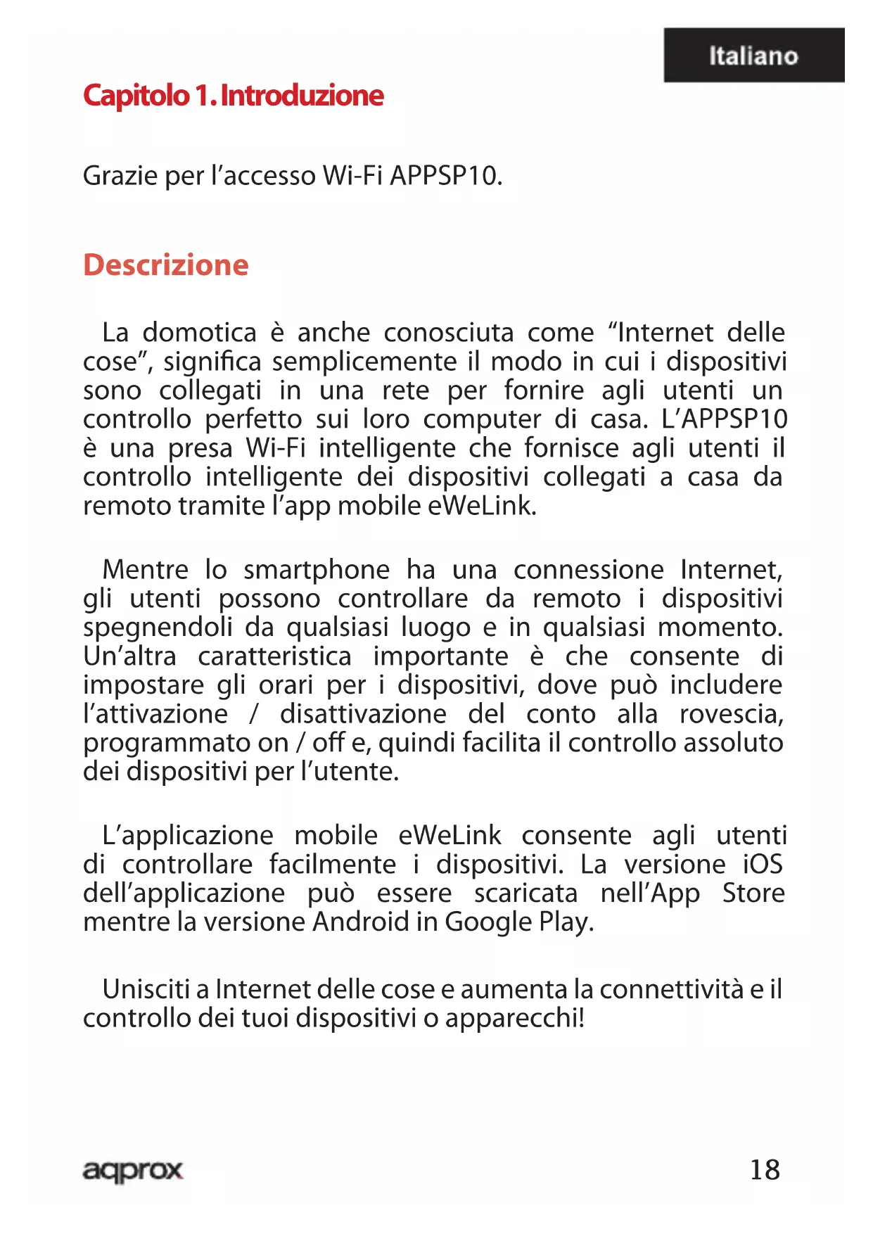Scarica le istruzioni per il tuo Casa intelligente in formato PDF gratuitamente! Trova il tuo manuale appSP10 - Approx e riprendi in mano il tuo dispositivo elettronico. In questa pagina sono pubblicati tutti i documenti necessari per l'utilizzo del tuo dispositivo. appSP10 del marchio Approx.