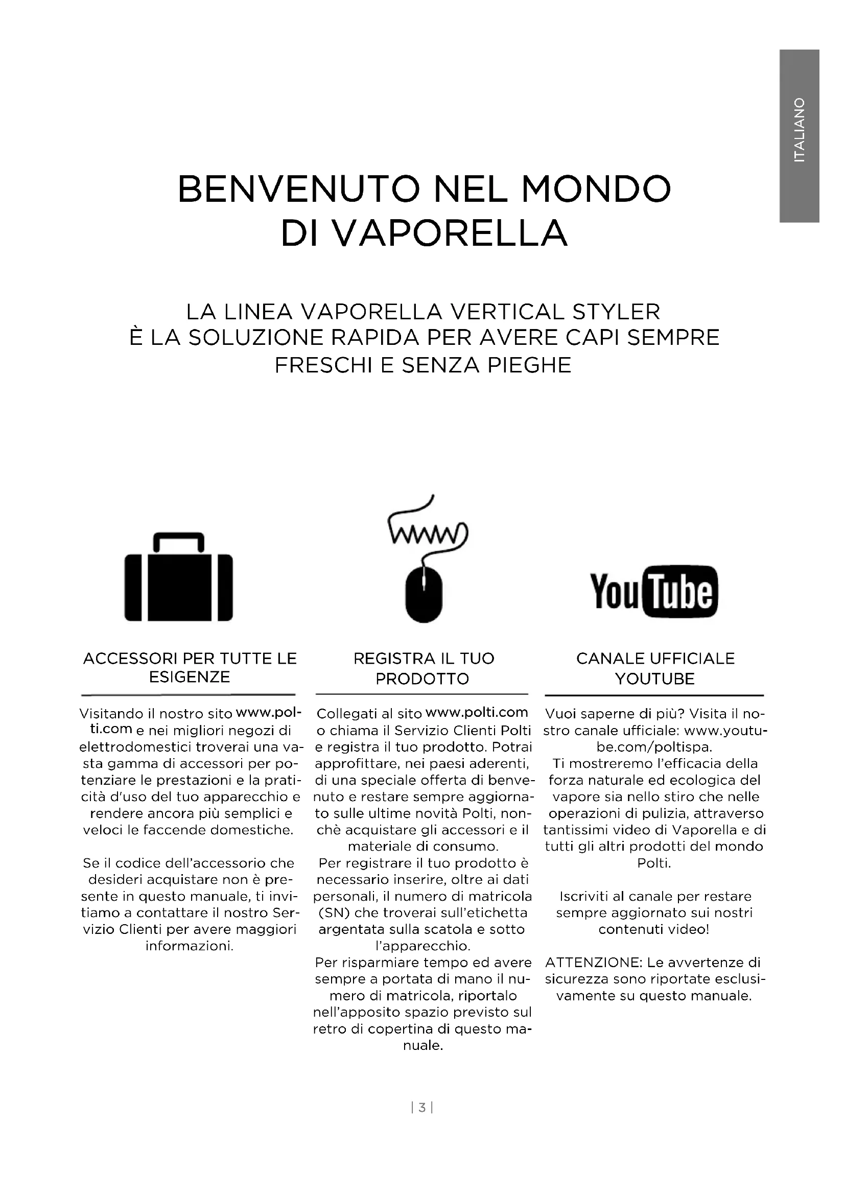 PRODOTTO Collegati al sito www.polti.com o chiama il Servizio Clienti Polti e registra il tuo prodotto. Potrai approfittare, nei paesi aderenti, di una speciale offerta di benve- nuto e restare sempre aggiorna- to sulle ultime novità Polti, non- chè acquistare gli accessori e il materiale di consumo. Per registrare il tuo prodotto è necessario inserire, oltre ai dati personali, il numero di matricola (SN) che troverai sull’etichetta argentata sulla scatola e sotto l’apparecchio. Per risparmiare tempo ed avere sempre a portata di mano il nu- mero di matricola, riportalo nell’apposito spazio previsto sul retro di copertina di questo ma- nuale. CANALE UFFICIALE YOUTUBE Vuoi saperne di più? Visita il no- stro canale ufficiale: www.youtu- be.com/poltispa. Ti mostreremo l’efficacia della forza naturale ed ecologica del vapore sia nello stiro che nelle operazioni di pulizia, attraverso tantissimi video di Vaporella e di tutti gli altri prodotti del mondo Polti. Iscriviti al canale per restare sempre aggiornato sui nostri contenuti video! ATTENZIONE: Le avvertenze di sicurezza sono riportate esclusi- vamente su questo manuale.ITALIANO | 4 |