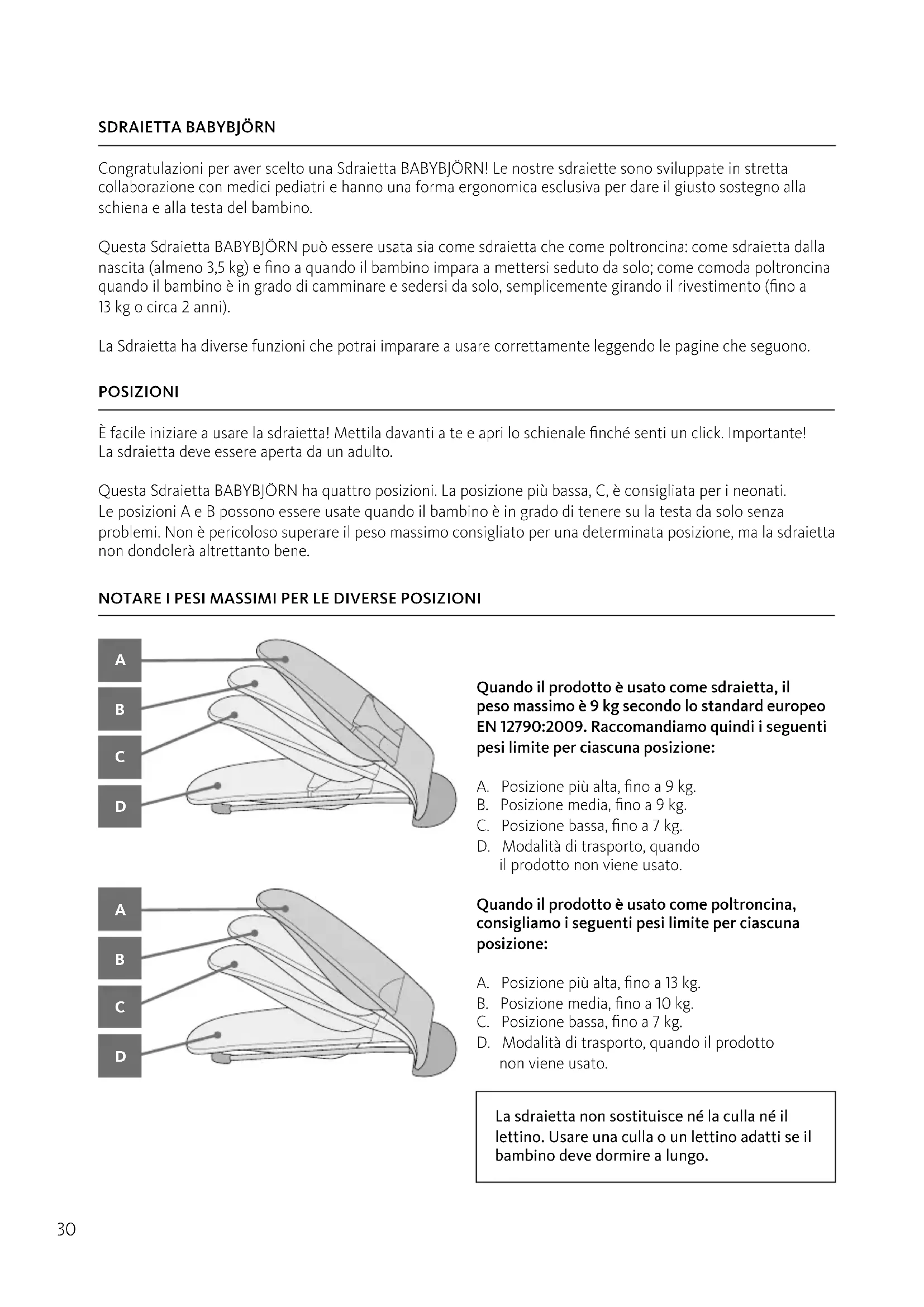 Congratulazioni per aver scelto una Sdraietta BABYBJÖRN! Le nostre sdraiette sono sviluppate in stretta collaborazione con medici pediatri e hanno una forma ergonomica esclusiva per dare il giusto sostegno alla schiena e alla testa del bambino. Questa Sdraietta BABYBJÖRN può essere usata sia come sdraietta che come poltroncina: come sdraietta dalla nascita (almeno 3,5 kg) e fino a quando il bambino impara a mettersi seduto da solo; come comoda poltroncina quando il bambino è in grado di camminare e sedersi da solo, semplicemente girando il rivestimento (fino a 13kg o circa 2 anni). La Sdraietta ha diverse funzioni che potrai imparare a usare correttamente leggendo le pagine che seguono. Quando il prodotto è usato come sdraietta, il peso massimo è 9 kg secondo lo standard europeo EN12790:2009. Raccomandiamo quindi i seguenti pesi limite per ciascuna posizione: A. Posizione più alta, fino a 9 kg. B. Posizione media, fino a 9 kg. C. Posizione bassa, fino a 7 kg. D. Modalità di trasporto, quando il prodotto non viene usato. NOTARE I PESI MASSIMI PER LE DIVERSE POSIZIONI Quando il prodotto è usato come poltroncina, consigliamo i seguenti pesi limite per ciascuna posizione: A. Posizione più alta, fino a 13 kg. B. Posizione media, fino a 10 kg. C. Posizione bassa, fino a 7 kg. D. Modalità di trasporto, quando il prodotto non viene usato. POSIZIONI È facile iniziare a usare la sdraietta! Mettila davanti a te e apri lo schienale finché senti un click. Importante! La sdraietta deve essere aperta da un adulto. Questa Sdraietta BABYBJÖRN ha quattro posizioni. La posizione più bassa, C, è consigliata per i neonati. Leposizioni A e B possono essere usate quando il bambino è in grado di tenere su la testa da solo senza problemi. Non è pericoloso superare il peso massimo consigliato per una determinata posizione, ma la sdraietta non dondolerà altrettanto bene. La sdraietta non sostituisce né la culla né il lettino. Usare una culla o un lettino adatti se il bambino deve dormire a lungo.31