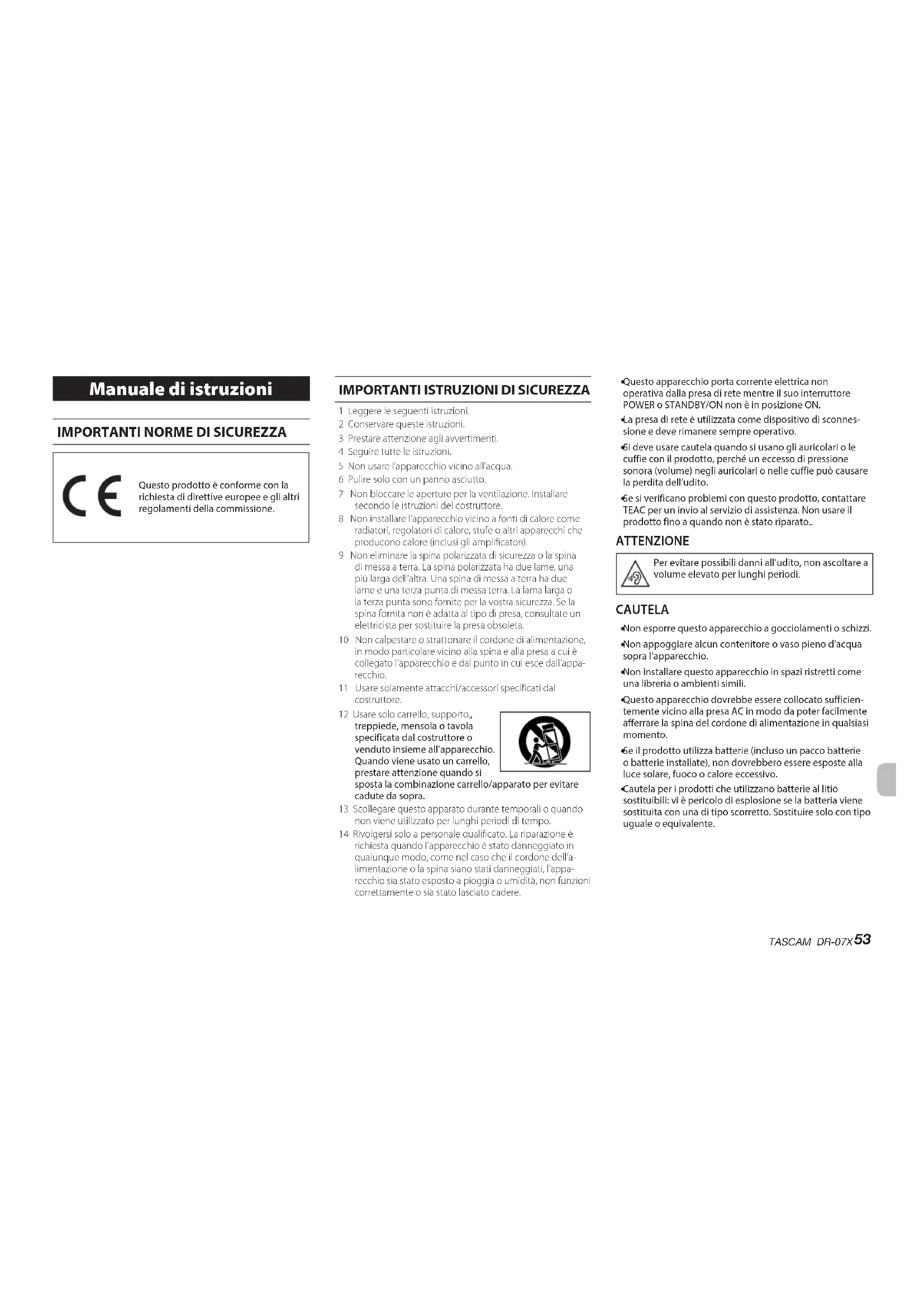 Se si verificano problemi con questo prodotto, contattare TEAC per un invio al servizio di assistenza. Non usare il prodotto fino a quando non è stato riparato.. ATTENZIONE Per evitare possibili danni all’udito, non ascoltare a volume elevato per lunghi periodi. CAUTELA
