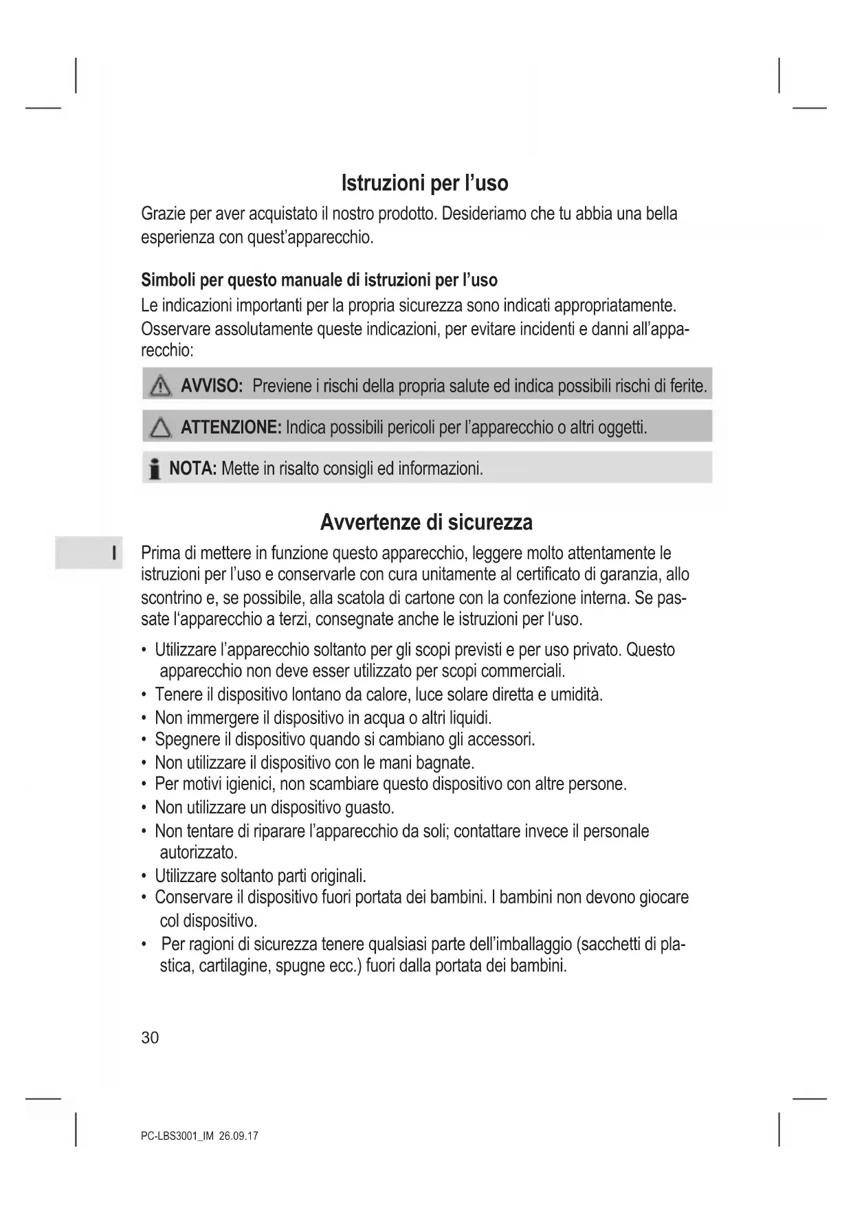- Per ragioni di sicurezza tenere qualsiasi parte dell’imballaggio (sacchetti di pla- stica, cartilagine, spugne ecc.) fuori dalla portata dei bambini.PC-LBS3001_IM 26.09.17