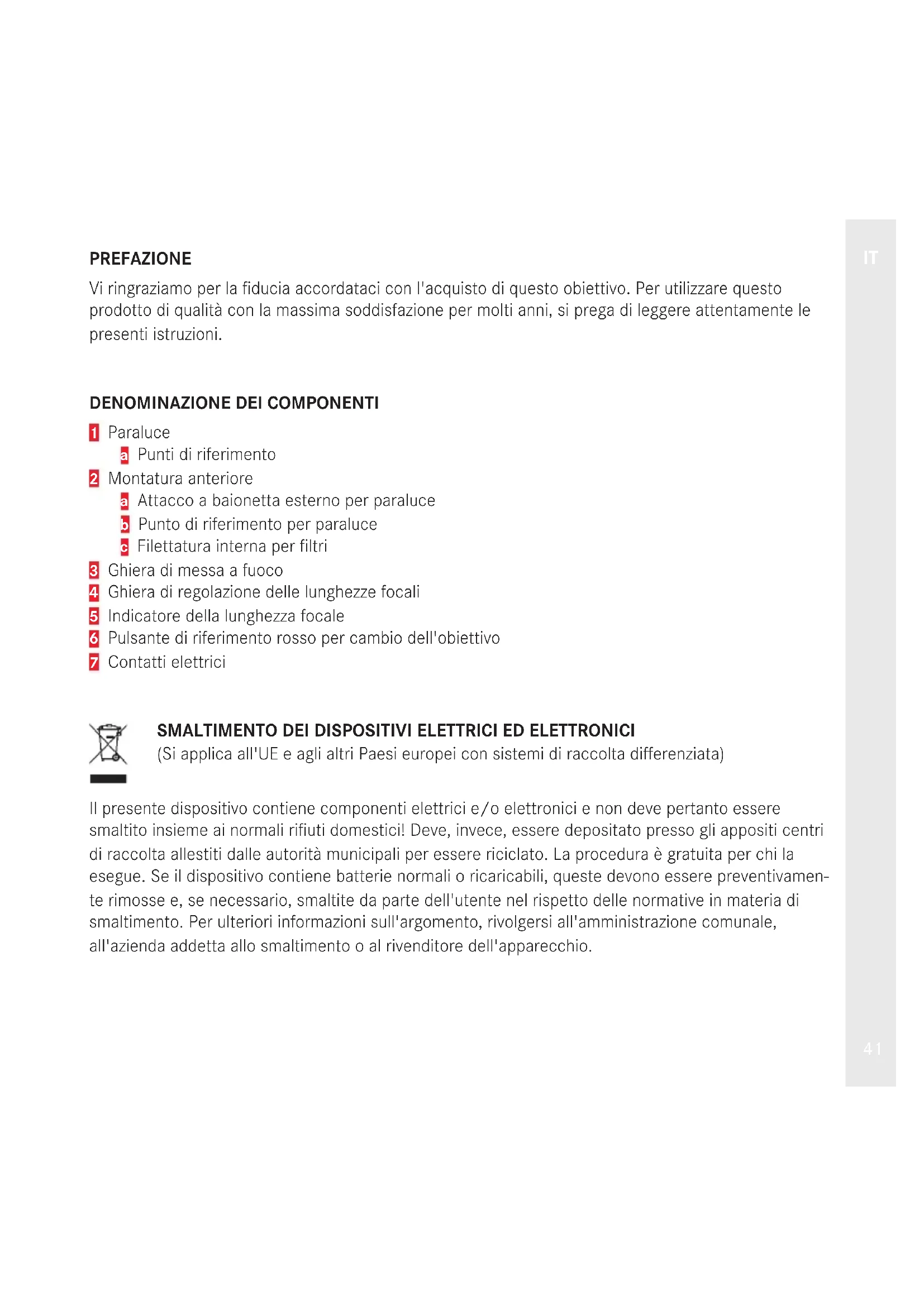 PREFAZIONE Vi ringraziamo per la fiducia accordataci con l'acquisto di questo obiettivo. Per utilizzare questo prodotto di qualità con la massima soddisfazione per molti anni, si prega di leggere attentamente le presenti istruzioni.