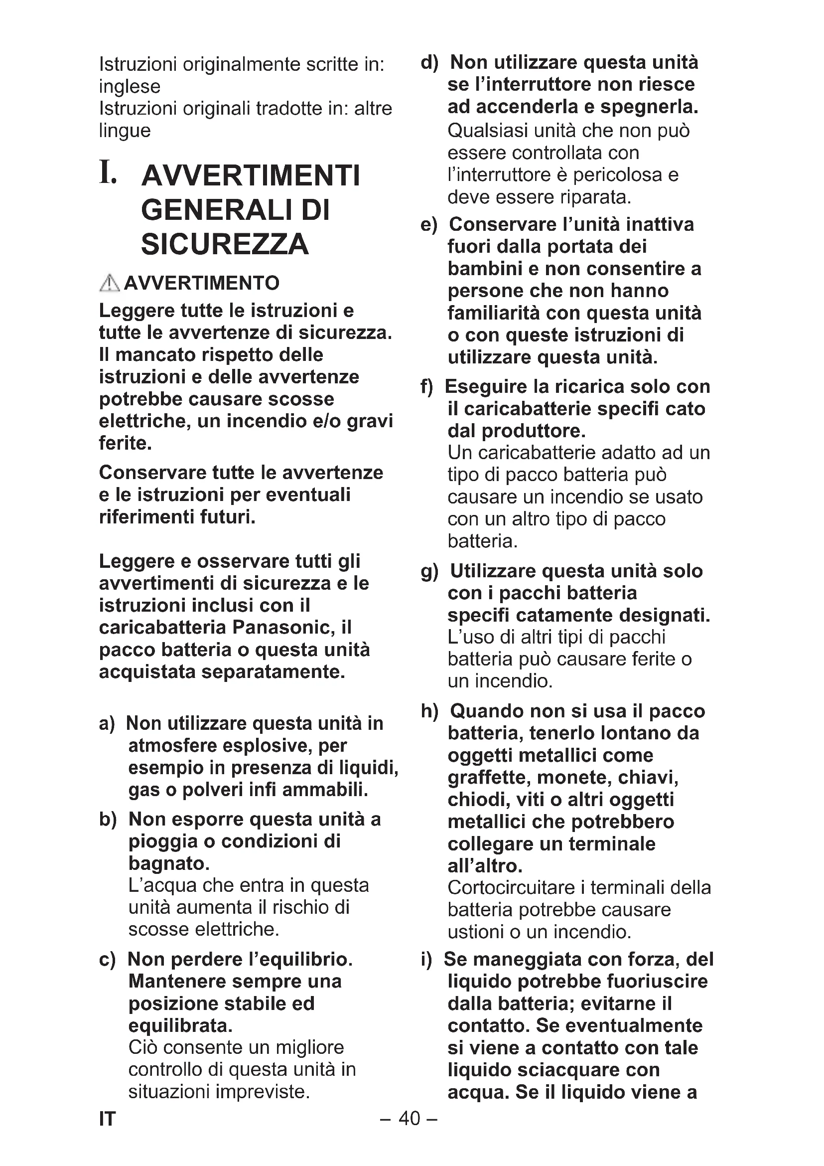 AVVERTIMENTI GENERALI DI SICUREZZA AVVERTIMENTO Leggere tutte le istruzioni e tutte le avvertenze di sicurezza. Il mancato rispetto delle istruzioni e delle avvertenze potrebbe causare scosse elettriche, un incendio e/o gravi ferite. Conservare tutte le avvertenze e le istruzioni per eventuali riferimenti futuri. Leggere e osservare tutti gli avvertimenti di sicurezza e le istruzioni inclusi con il caricabatteria Panasonic, il pacco batteria o questa unità acquistata separatamente. a) Non utilizzare questa unità in atmosfere esplosive, per esempio in presenza di liquidi, gas o polveri infi ammabili. b) Non esporre questa unità a pioggia o condizioni di bagnato. L’acqua che entra in questa unità aumenta il rischio di scosse elettriche. c) Non perdere l’equilibrio. Mantenere sempre una posizione stabile ed equilibrata. Ciò consente un migliore controllo di questa unità in situazioni impreviste. d) Non utilizzare questa unità se l’interruttore non riesce ad accenderla e spegnerla. Qualsiasi unità che non può essere controllata con l’interruttore è pericolosa e deve essere riparata. e) Conservare l’unità inattiva fuori dalla portata dei bambini e non consentire a persone che non hanno familiarità con questa unità o con queste istruzioni di utilizzare questa unità. f) Eseguire la ricarica solo con il caricabatterie specifi cato dal produttore. Un caricabatterie adatto ad un tipo di pacco batteria può causare un incendio se usato con un altro tipo di pacco batteria. g) Utilizzare questa unità solo con i pacchi batteria specifi catamente designati. L’uso di altri tipi di pacchi batteria può causare ferite o un incendio. h) Quando non si usa il pacco batteria, tenerlo lontano da oggetti metallici come graffette, monete, chiavi, chiodi, viti o altri oggetti metallici che potrebbero collegare un terminale all’altro. Cortocircuitare i terminali della batteria potrebbe causare ustioni o un incendio.