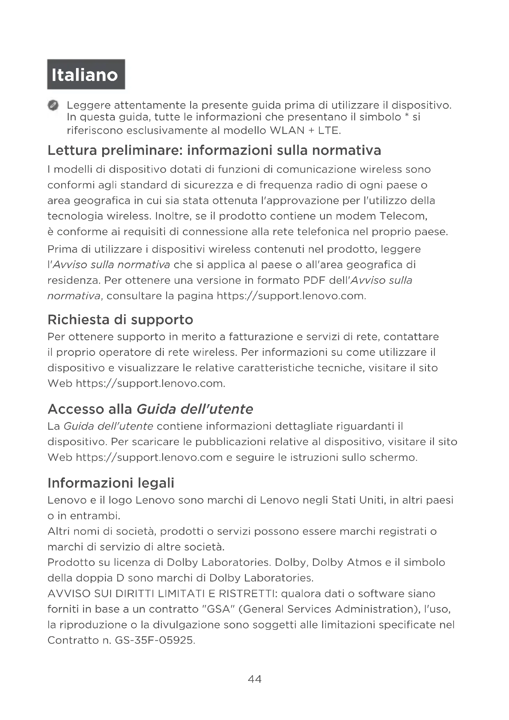 Lettura preliminare: informazioni sulla normativa I modelli di dispositivo dotati di funzioni di comunicazione wireless sono conformi agli standard di sicurezza e di frequenza radio di ogni paese o area geografica in cui sia stata ottenuta l'approvazione per l'utilizzo della tecnologia wireless. Inoltre, se il prodotto contiene un modem Telecom, è conforme ai requisiti di connessione alla rete telefonica nel proprio paese. Prima di utilizzare i dispositivi wireless contenuti nel prodotto, leggere l'Avviso sulla normativa che si applica al paese o all'area geografica di residenza. Per ottenere una versione in formato PDF dell'Avviso sulla normativa, consultare la pagina https://support.lenovo.com. Richiesta di supporto Per ottenere supporto in merito a fatturazione e servizi di rete, contattare il proprio operatore di rete wireless. Per informazioni su come utilizzare il dispositivo e visualizzare le relative caratteristiche tecniche, visitare il sito Web https://support.lenovo.com. Accesso alla Guida dell'utente La Guida dell'utente contiene informazioni dettagliate riguardanti il dispositivo. Per scaricare le pubblicazioni relative al dispositivo, visitare il sito Web https://support.lenovo.com e seguire le istruzioni sullo schermo. Informazioni legali Lenovo e il logo Lenovo sono marchi di Lenovo negli Stati Uniti, in altri paesi o in entrambi. Altri nomi di società, prodotti o servizi possono essere marchi registrati o marchi di servizio di altre società. Prodotto su licenza di Dolby Laboratories. Dolby, Dolby Atmos e il simbolo della doppia D sono marchi di Dolby Laboratories. AVVISO SUI DIRITTI LIMITATI E RISTRETTI: qualora dati o software siano forniti in base a un contratto "GSA" (General Services Administration), l'uso, la riproduzione o la divulgazione sono soggetti alle limitazioni specificate nel Contratto n. GS-35F-05925. Italiano45 Panoramica del dispositivo Modello Versione Lenovo YT-X705F WLAN Lenovo YT-X705L LTE Lenovo YT-X705X LTE+Voce