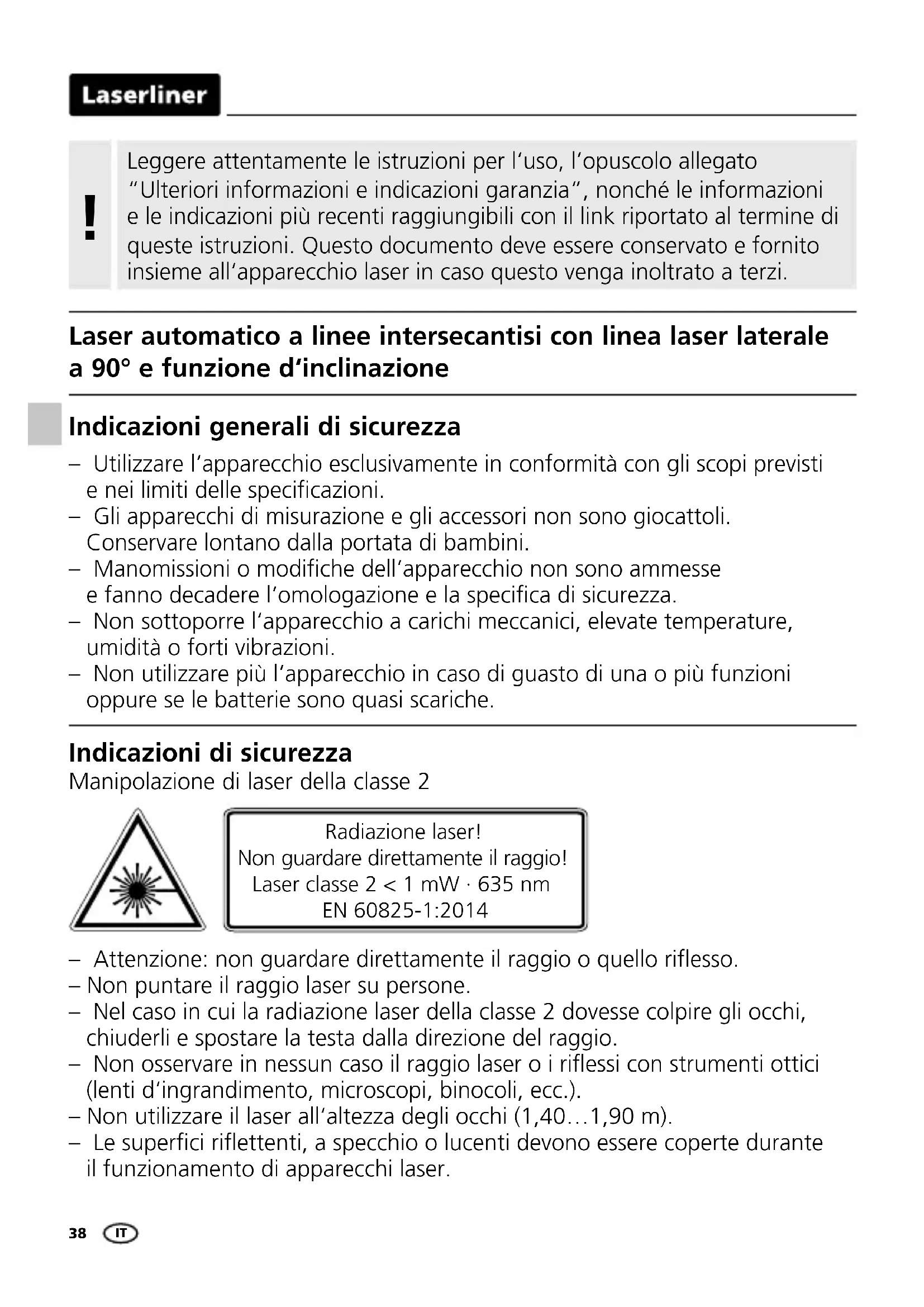 – Attenzione: non guardare direttamente il raggio o quello riesso. – Non puntare il raggio laser su persone. – Nel caso in cui la radiazione laser della classe 2 dovesse colpire gli occhi, chiuderli e spostare la testa dalla direzione del raggio. – Non osservare in nessun caso il raggio laser o i riessi con strumenti ottici (lenti d‘ingrandimento, microscopi, binocoli, ecc.). – Non utilizzare il laser all‘altezza degli occhi (1,40…1,90 m). – Le superci riettenti, a specchio o lucenti devono essere coperte durante il funzionamento di apparecchi laser. Indicazioni di sicurezza Manipolazione di laser della classe 2 – Utilizzare l‘apparecchio esclusivamente in conformità con gli scopi previsti e nei limiti delle specicazioni. – Gli apparecchi di misurazione e gli accessori non sono giocattoli. Conservare lontano dalla portata di bambini. – Manomissioni o modiche dell‘apparecchio non sono ammesse e fanno decadere l‘omologazione e la specica di sicurezza. – Non sottoporre l‘apparecchio a carichi meccanici, elevate temperature, umidità o forti vibrazioni. – Non utilizzare più l‘apparecchio in caso di guasto di una o più funzioni oppure se le batterie sono quasi scariche. Indicazioni generali di sicurezza Radiazione laser! Non guardare direttamente il raggio! Laser classe 2 < 1 mW · 635 nm EN 60825-1:2014 Laser automatico a linee intersecantisi con linea laser laterale a 90° e funzione d‘inclinazione IT39 CompactCube-Laser 3