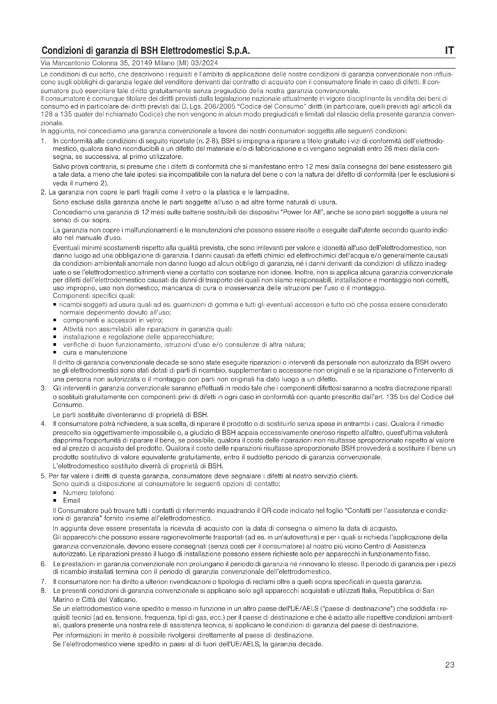 Via Marcantonio Colonna 35, 20149 Milano (MI) 03/2024 Le condizioni di cui sotto, che descrivono i requisiti e l’ambito di applicazione delle nostre condizioni di garanzia convenzionale non influis- cono sugli obblighi di garanzia legale del venditore derivanti dal contratto di acquisto con il consumatore finale in caso di difetti. Il con- sumatore può esercitare tale diritto gratuitamente senza pregiudizio della nostra garanzia convenzionale. Il consumatore è comunque titolare dei diritti previsti dalla legislazione nazionale attualmente in vigore disciplinante la vendita dei beni di consumo ed in particolare dei diritti previsti dal D. Lgs. 206/2005 “Codice del Consumo” diritti (in particolare, quelli previsti agli articoli da 128a135 quater del richiamato Codice) che non vengono in alcun modo pregiudicati e limitati dal rilascio della presente garanzia conven- zionale. In aggiunta, noi concediamo una garanzia convenzionale a favore dei nostri consumatori soggetta alle seguenti condizioni: 1. In conformità alle condizioni di seguito riportate (n. 2-8), BSH si impegna a riparare a titolo gratuito i vizi di conformità dell’elettrodo- mestico, qualora siano riconducibili a un difetto del materiale e/o di fabbricazione e ci vengano segnalati entro 26 mesi dalla con- segna, se successiva, al primo utilizzatore. Salvo prova contraria, si presume che i difetti di conformità che si manifestano entro 12 mesi dalla consegna del bene esistessero già a tale data, a meno che tale ipotesi sia incompatibile con la natura del bene o con la natura del difetto di conformità (per le esclusioni si veda il numero 2).
