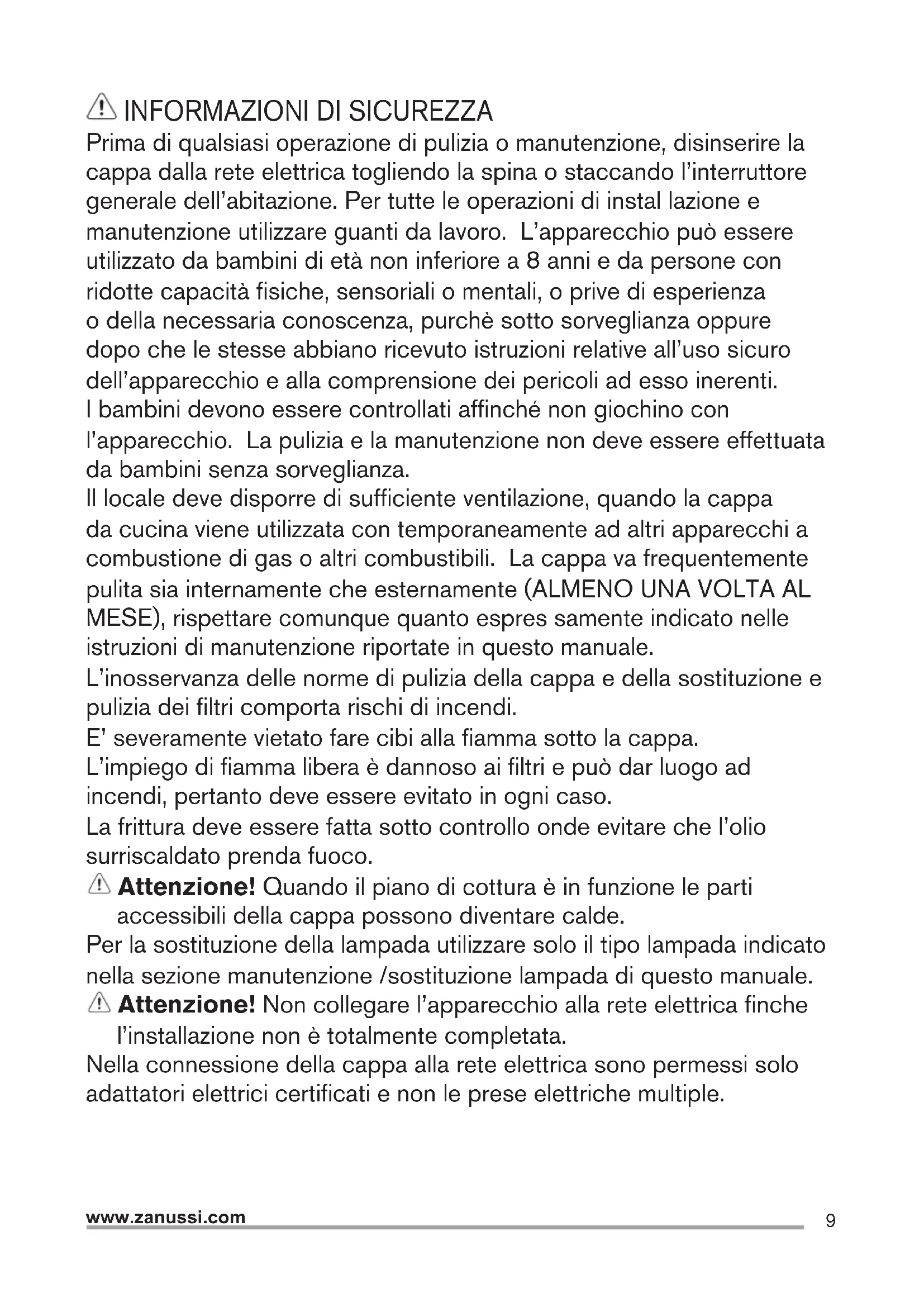 Prima di qualsiasi operazione di pulizia o manutenzione, disinserire la cappa dalla rete elettrica togliendo la spina o staccando l’interruttore generale dell’abitazione. Per tutte le operazioni di instal lazione e manutenzione utilizzare guanti da lavoro. L’apparecchio può essere utilizzato da bambini di età non inferiore a 8 anni e da persone con ridotte capacità fisiche, sensoriali o mentali, o prive di esperienza o della necessaria conoscenza, purchè sotto sorveglianza oppure dopo che le stesse abbiano ricevuto istruzioni relative all’uso sicuro dell’apparecchio e alla comprensione dei pericoli ad esso inerenti. I bambini devono essere controllati affinché non giochino con l’apparecchio. La pulizia e la manutenzione non deve essere effettuata da bambini senza sorveglianza. Il locale deve disporre di sufficiente ventilazione, quando la cappa da cucina viene utilizzata con temporaneamente ad altri apparecchi a combustione di gas o altri combustibili. La cappa va frequentemente pulita sia internamente che esternamente (ALMENO UNA VOLTA AL MESE), rispettare comunque quanto espres samente indicato nelle istruzioni di manutenzione riportate in questo manuale. L’inosservanza delle norme di pulizia della cappa e della sostituzione e pulizia dei filtri comporta rischi di incendi. E’ severamente vietato fare cibi alla fiamma sotto la cappa. L’impiego di fiamma libera è dannoso ai filtri e può dar luogo ad incendi, pertanto deve essere evitato in ogni caso. La frittura deve essere fatta sotto controllo onde evitare che l’olio surriscaldato prenda fuoco. Attenzione! Quando il piano di cottura è in funzione le parti accessibili della cappa possono diventare calde. Per la sostituzione della lampada utilizzare solo il tipo lampada indicato nella sezione manutenzione /sostituzione lampada di questo manuale. Attenzione! Non collegare l’apparecchio alla rete elettrica finche l’installazione non è totalmente completata. Nella connessione della cappa alla rete elettrica sono permessi solo adattatori elettrici certificati e non le prese elettriche multiple.10 www.zanussi.com