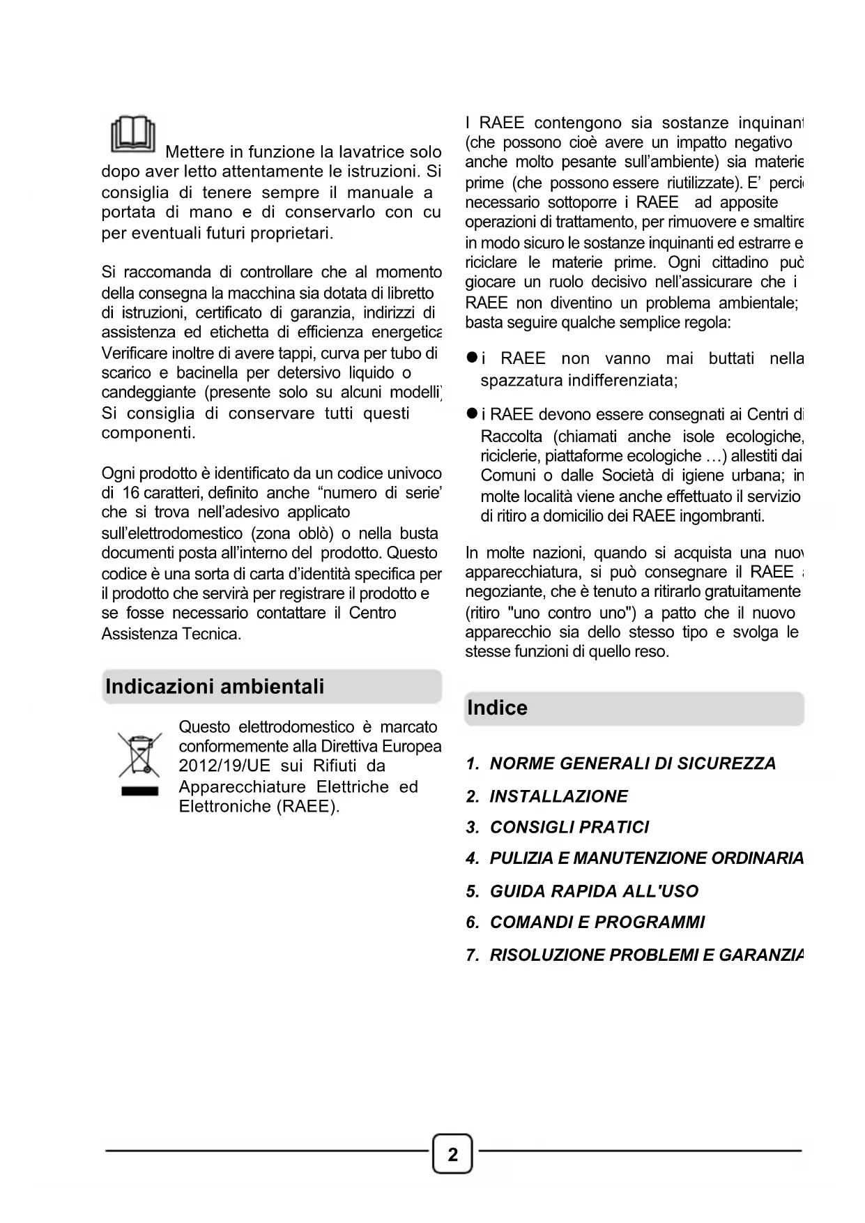 Mettere in funzione la lavatrice solo dopo aver letto attentamente le istruzioni. Si consiglia di tenere sempre il manuale a portata di mano e di conservarlo con cura per eventuali futuri proprietari. Si raccomanda di controllare che al momento della consegna la macchina sia dotata di libretto di istruzioni, certificato di garanzia, indirizzi di assistenza ed etichetta di efficienza energetica. Verificare inoltre di avere tappi, curva per tubo di scarico e bacinella per detersivo liquido o candeggiante (presente solo su alcuni modelli). Si consiglia di conservare tutti questi componenti.