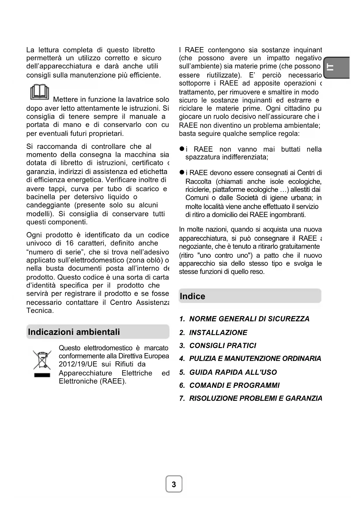 La lettura completa di questo libretto permetterà un utilizzo corretto e sicuro dell’apparecchiatura e darà anche utili consigli sulla manutenzione più efficiente. Mettere in funzione la lavatrice solo dopo aver letto attentamente le istruzioni. Si consiglia di tenere sempre il manuale a portata di mano e di conservarlo con cura per eventuali futuri proprietari. Si raccomanda di controllare che al momento della consegna la macchina sia dotata di libretto di istruzioni, certificato di garanzia, indirizzi di assistenza ed etichetta di efficienza energetica. Verificare inoltre di avere tappi, curva per tubo di scarico e bacinella per detersivo liquido o candeggiante (presente solo su alcuni modelli). Si consiglia di conservare tutti questi componenti. Ogni prodotto è identificato da un codice univoco di 16 caratteri, definito anche “numero di serie”, che si trova nell’adesivo applicato sull’elettrodomestico (zona oblò) o nella busta documenti posta all’interno del prodotto. Questo codice è una sorta di carta d’identità specifica per il prodotto che servirà per registrare il prodotto e se fosse necessario contattare il Centro Assistenza Tecnica.