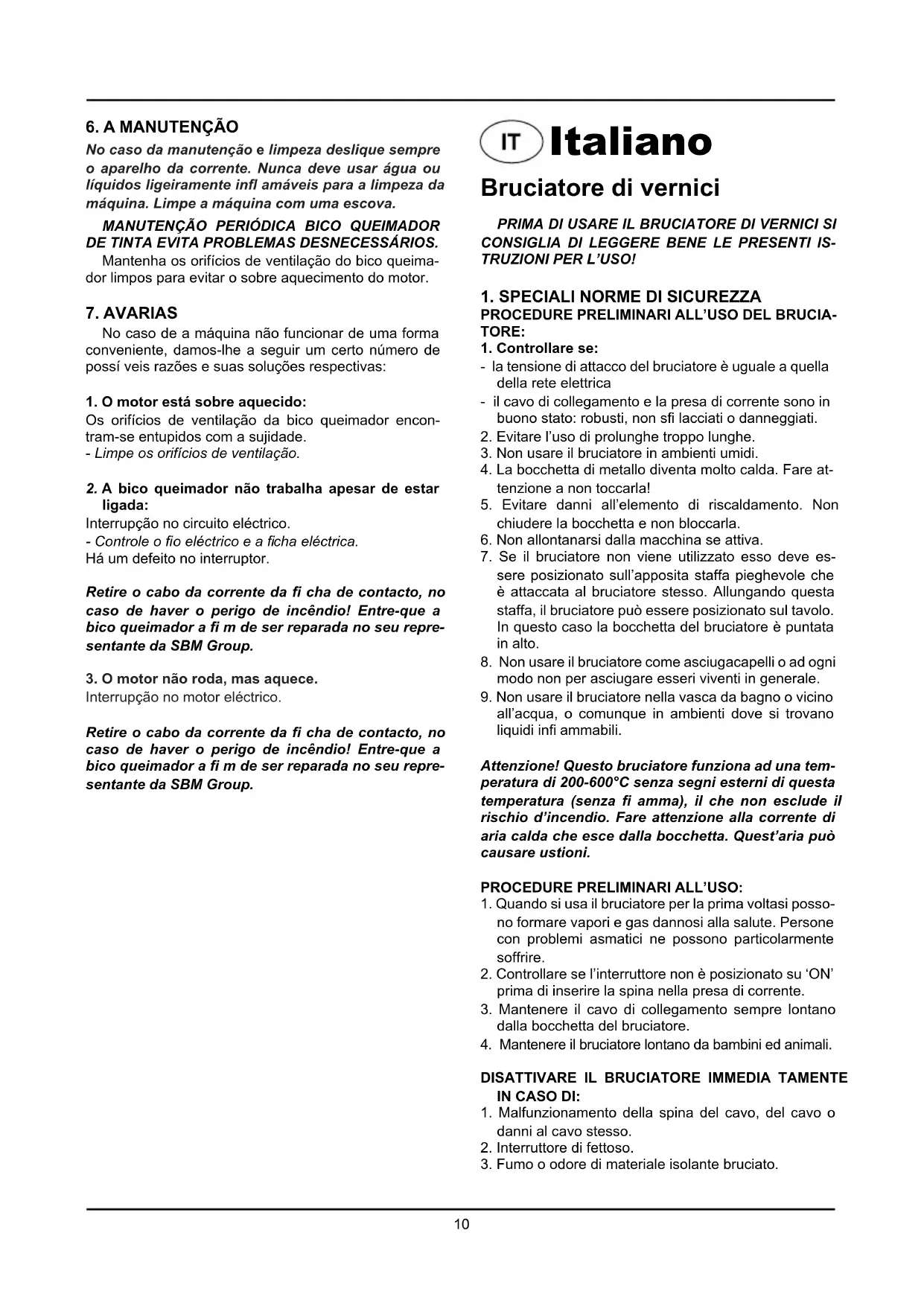 Interruzione nel motore elettrico. Staccare la spina dalla presa di corrente, c’è peri- colo d’incendio! Rivolgersi al concessionario SBM Group per la riparazione.12 Verfafbrander