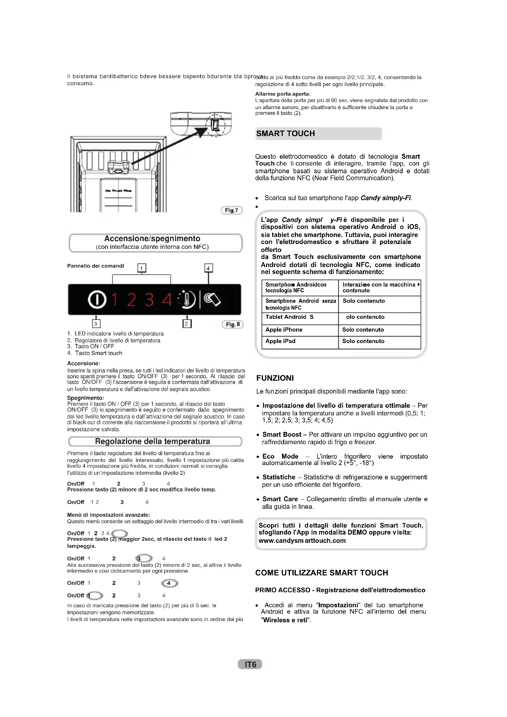 livello 4 impostazione più fredda, in condizioni normali si consiglia l’utilizzo di un’impostazione intermedia (livello 2)In caso di mancata pressione del tasto (2) per più di 5 sec. le impostazioni vengono memorizzate.I livelli di temperatura nelle impostazioni avanzate sono in ordine dal più On/O 1 2 3 4 Pressione tasto (2) minore di 2 sec modifica livello temp.On/O 1 2 3 4Menù di impostazioni avanzate:Questo menù consente un settaggio del livello intermedio di tra i vari livelli.On/O 1 2 3 4 Pressione tasto (2) maggior 2sec, al rilascio del tasto il led 2 lampeggia.On/O 1 2 3 4 Alla successiva pressione del tasto (2) minore di 2 sec, si attiva il livello intermedio e cosi ciclicamente per ogni pressioneOn/O 1 2 3 On/O 1 2 3 4 Regolazione della temperatura caldo al più freddo come da esempio 2/2,1/2, 3/2, 4, consentendo la regolazione di 4 sotto livelli per ogni livello principale.Allarme porta aperta:L’apertura della porta per più di 90 sec. viene segnalata dal prodotto con un allarme sonoro, per disattivarlo è suciente chiudere la porta o premere il tasto (2).(con interfaccia utente interna con NFC) Questo elettrodomestico è dotato di tecnologia Smart Touch che ti consente di interagire, tramite l'app, con gli smartphone basati su sistema operativo Android e dotati della funzione NFC (Near Field Communication). Scarica sul tuo smartphone l'app Candy simply-Fi.