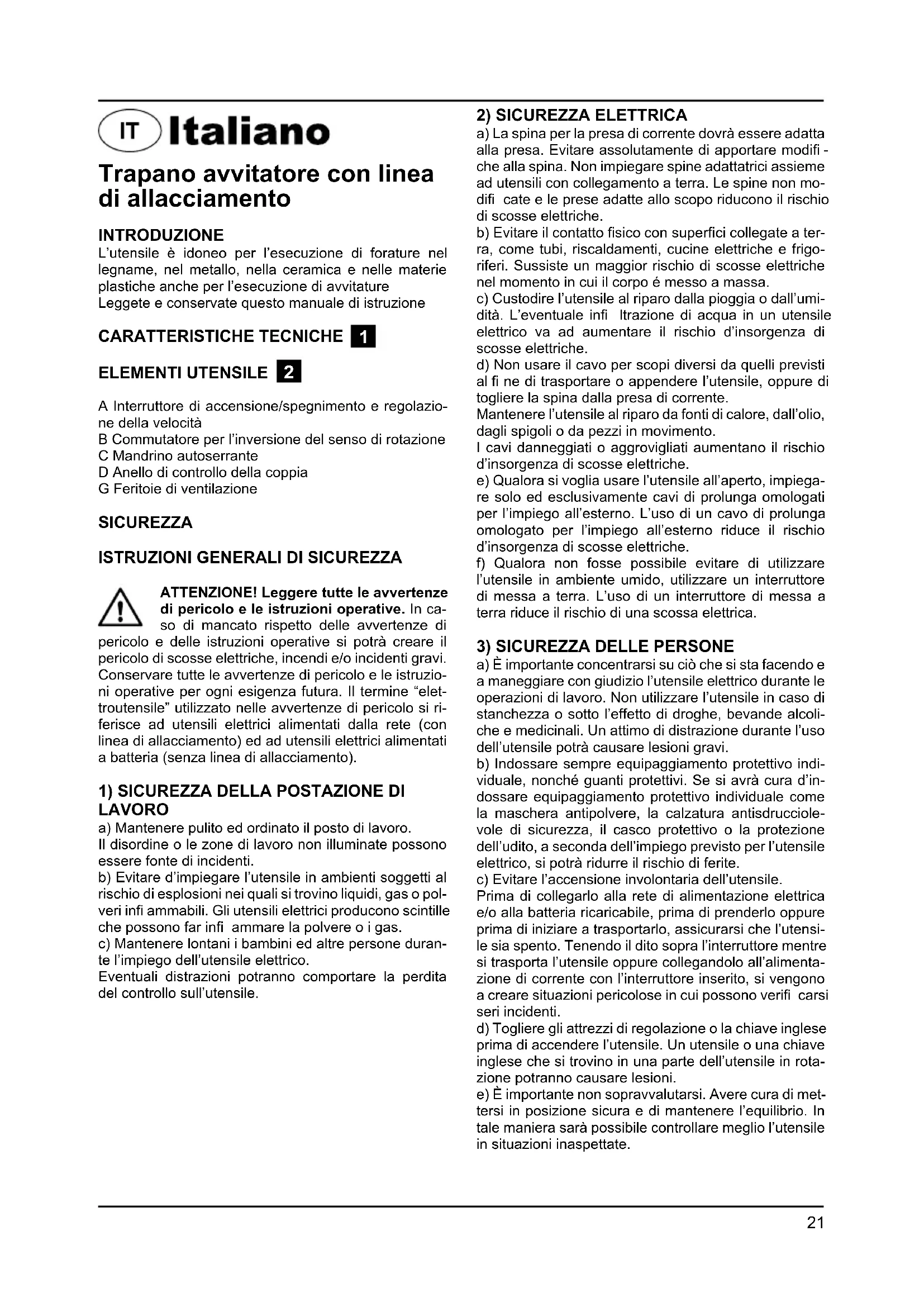 ELEMENTI UTENSILE 2 A Interruttore di accensione/spegnimento e regolazio- ne della velocità B Commutatore per l’inversione del senso di rotazione C Mandrino autoserrante D Anello di controllo della coppia G Feritoie di ventilazione SICUREZZA