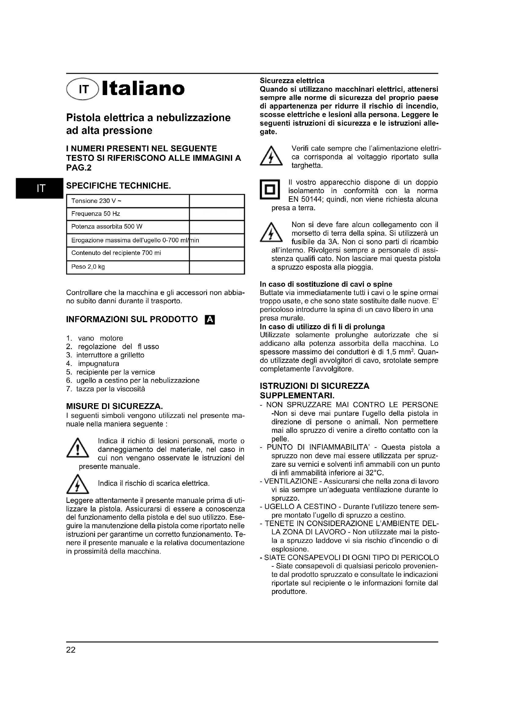 MISURE DI SICUREZZA. I seguenti simboli vengono utilizzati nel presente ma- nuale nella maniera seguente : Indica il richio di lesioni personali, morte o danneggiamento del materiale, nel caso in cui non vengano osservate le istruzioni del presente manuale. Indica il rischio di scarica elettrica. Leggere attentamente il presente manuale prima di uti- lizzare la pistola. Assicurarsi di essere a conoscenza del funzionamento della pistola e del suo utilizzo. Ese- guire la manutenzione della pistola come riportato nelle istruzioni per garantirne un corretto funzionamento. Te- nere il presente manuale e la relativa documentazione in prossimità della macchina. Sicurezza elettrica Quando si utilizzano macchinari elettrici, attenersi sempre alle norme di sicurezza del proprio paese di appartenenza per ridurre il rischio di incendio, scosse elettriche e lesioni alla persona. Leggere le seguenti istruzioni di sicurezza e le istruzioni alle- gate. Verifi cate sempre che l’alimentazione elettri- ca corrisponda al voltaggio riportato sulla targhetta. Il vostro apparecchio dispone di un doppio isolamento in conformità con la norma EN 50144; quindi, non viene richiesta alcuna presa a terra. Non si deve fare alcun collegamento con il morsetto di terra della spina. Si utilizzerà un fusibile da 3A. Non ci sono parti di ricambio all’interno. Rivolgersi sempre a personale dì assi- stenza qualifi cato. Non lasciare mai questa pistola a spruzzo esposta alla pioggia. In caso di sostituzione di cavi o spine Buttate via immediatamente tutti i cavi o le spine ormai troppo usate, e che sono state sostituite dalle nuove. E’ pericoloso introdurre la spina di un cavo libero in una presa murale. In caso di utilizzo di fi li di prolunga Utilizzate solamente prolunghe autorizzate che si addicano alla potenza assorbita della macchina. Lo spessore massimo dei conduttori è di 1,5 mm