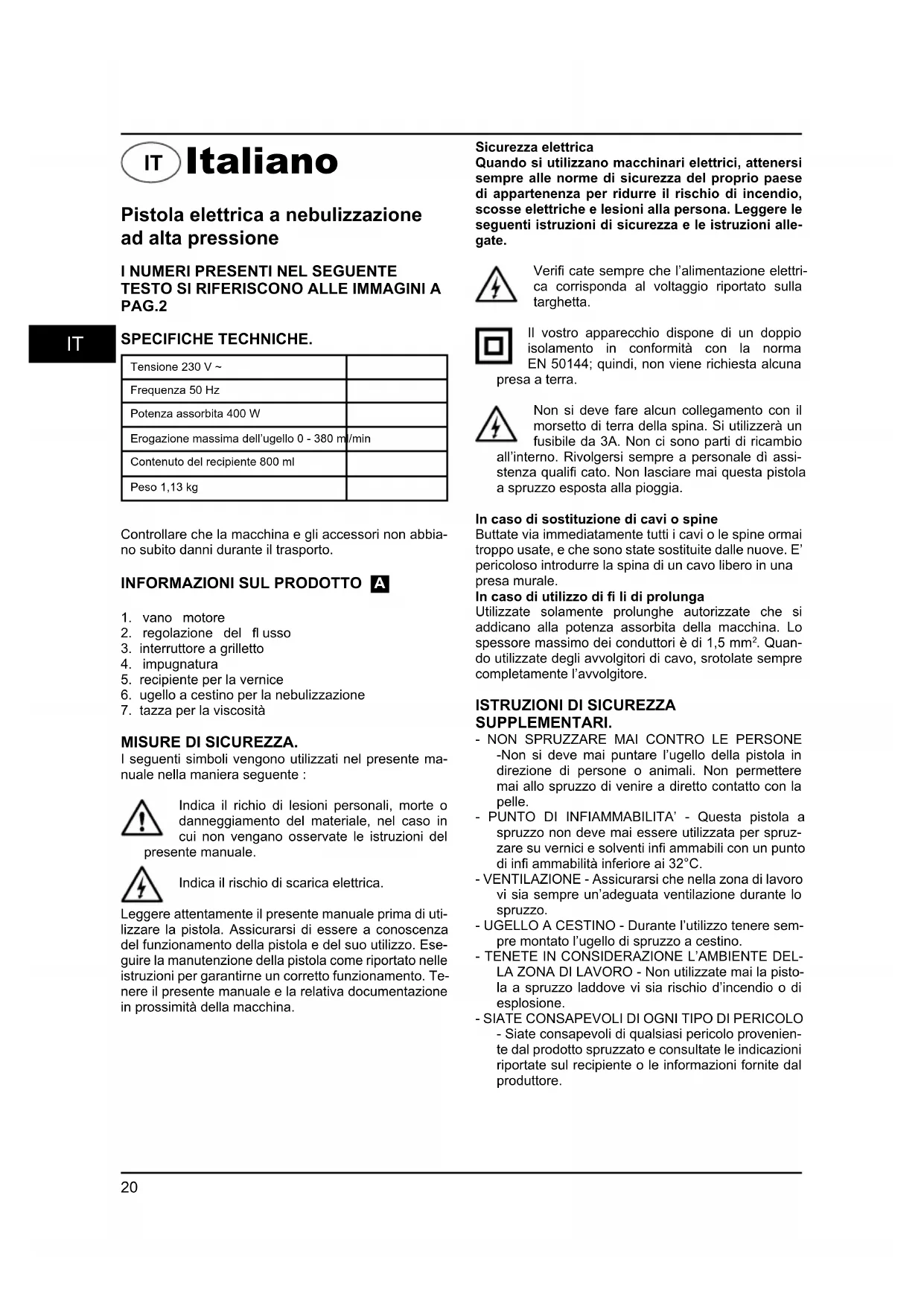 MISURE DI SICUREZZA. I seguenti simboli vengono utilizzati nel presente ma- nuale nella maniera seguente : Indica il richio di lesioni personali, morte o danneggiamento del materiale, nel caso in cui non vengano osservate le istruzioni del presente manuale. Indica il rischio di scarica elettrica. Leggere attentamente il presente manuale prima di uti- lizzare la pistola. Assicurarsi di essere a conoscenza del funzionamento della pistola e del suo utilizzo. Ese- guire la manutenzione della pistola come riportato nelle istruzioni per garantirne un corretto funzionamento. Te- nere il presente manuale e la relativa documentazione in prossimità della macchina. Sicurezza elettrica Quando si utilizzano macchinari elettrici, attenersi sempre alle norme di sicurezza del proprio paese di appartenenza per ridurre il rischio di incendio, scosse elettriche e lesioni alla persona. Leggere le seguenti istruzioni di sicurezza e le istruzioni alle- gate. Verifi cate sempre che l’alimentazione elettri- ca corrisponda al voltaggio riportato sulla targhetta. Il vostro apparecchio dispone di un doppio isolamento in conformità con la norma EN 50144; quindi, non viene richiesta alcuna presa a terra. Non si deve fare alcun collegamento con il morsetto di terra della spina. Si utilizzerà un fusibile da 3A. Non ci sono parti di ricambio all’interno. Rivolgersi sempre a personale dì assi- stenza qualifi cato. Non lasciare mai questa pistola a spruzzo esposta alla pioggia. In caso di sostituzione di cavi o spine Buttate via immediatamente tutti i cavi o le spine ormai troppo usate, e che sono state sostituite dalle nuove. E’ pericoloso introdurre la spina di un cavo libero in una presa murale. In caso di utilizzo di fi li di prolunga Utilizzate solamente prolunghe autorizzate che si addicano alla potenza assorbita della macchina. Lo spessore massimo dei conduttori è di 1,5 mm