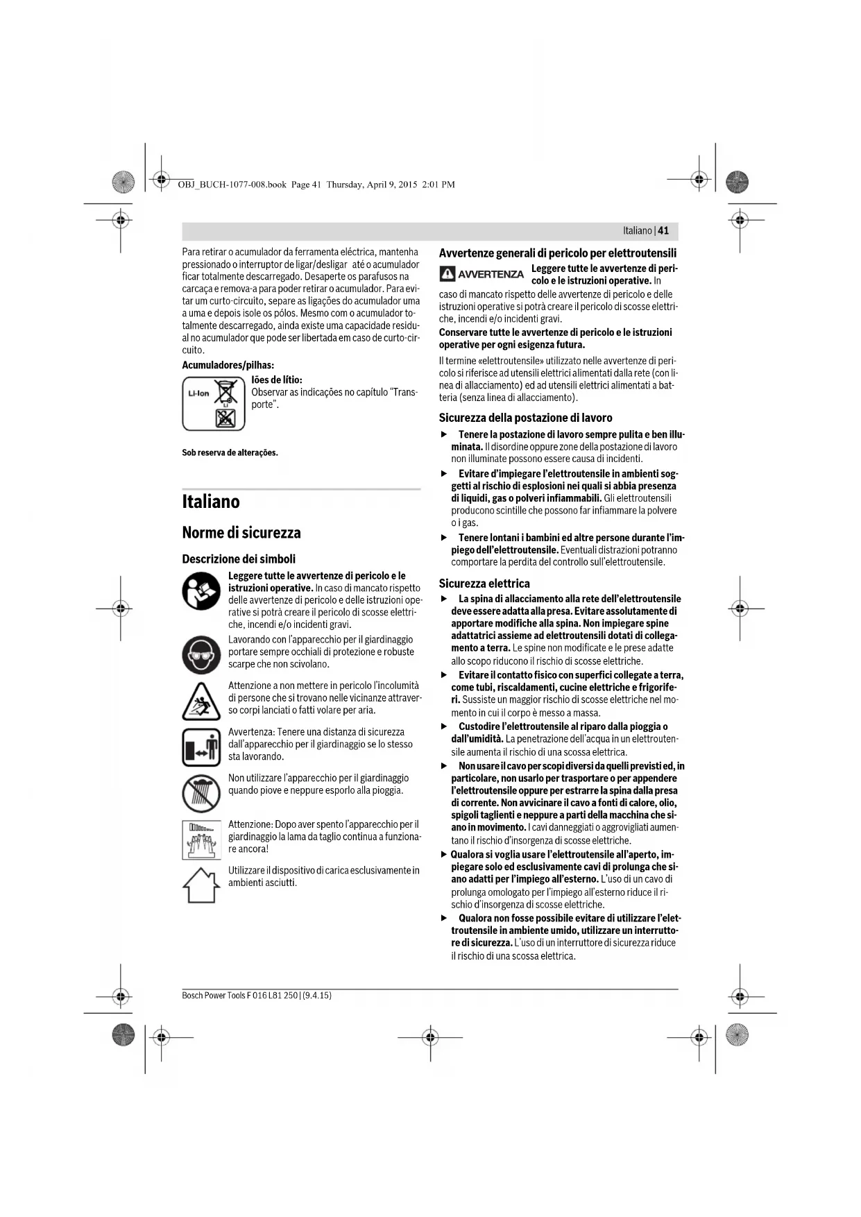 OBJ_BUCH-1077-008.book Page 39 Thursday, April 9, 2015 2:01 PM40 | Português F 016 L81 250 | (9.4.15) Bosch Power Tools Com o interruptor de ligar-desligar semi-premido ou comple- tamente premido, a indicação do estado de carga do acumu- lador indica durante alguns segundos o estado de carga do acumulador. Busca de erros Manutenção e limpeza Atenção! Desligar o aparelho de jardim antes de traba- lhos de manutenção ou de limpeza. A lâmina ainda con- tinua a se movimentar durante alguns minutos após ter desligado o aparelho de jardim. Cuidado! Não toque na lâmina em movimento. Manter o aparelho de jardim sempre limpo, para traba- lhar bem e de forma segura. Sempre usar luvas de protecção para trabalhar com o aparelho de jardim ou para realizar trabalhos de manu- tenção ou de limpeza. Controlar regularmente o aparelho de jardim quanto a defei- tos evidentes, como por exemplo fixações soltas e compo- nentes gastos ou danificados. Serviço pós-venda e consultoria de aplicação www.bosch-garden.com Para todas as questões e encomendas de peças sobressalen- tas é imprescindível indicar o número de produto de 10 dígitos como consta na placa de características da ferra- menta eléctrica. Portugal Robert Bosch LDA Avenida Infante D. Henrique Lotes 2E – 3E 1800 Lisboa Para efectuar o seu pedido online de peças entre na página www.ferramentasbosch.com. Tel.: 21 8500000 Fax: 21 8511096 Brasil Robert Bosch Ltda. Caixa postal 1195 13065-900 Campinas Tel.: (0800) 7045446 www.bosch.com.br/contacto Transporte Os acumuladores de iões de lítio, contidos, estão sujeitos ao direito de materiais perigosos. Os acumuladores podem ser transportados na rua pelo utilizador, sem mais obrigações. Na expedição por terceiros (por ex.: transporte aéreo ou ex- pedição), devem ser observadas as especiais exigências quanto à embalagem e à designação. Neste caso é necessário consultar um especialista de materiais perigosos ao preparar a peça a ser trabalhada. Eliminação Os aparelhos de jardim, os acessórios e as embalagens de- vem ser dispostos para uma reciclagem ecológica de matérias primas. Não deitar os aparelhos de jardinagem, carregadores e acu- muladores/pilhas no lixo doméstico! Apenas países da União Europeia: Conforme as Directivas Europeias 2012/19/UE relativa aos resíduos apare- lhos eléctricos e eletrónicos velhos e con- forme a directiva europeia 2006/66/CE re- lativa a acumuladores/pilhas defeituosos ou gastos, estes devem ser recolhidos separadamente e con- duzidos a uma reciclagem ecológica. Acumuladores integrados só devem ser retirados para serem descartados. O aparelho de jardinagem pode ser danificado se a carcaça for aberta. LED Capacidade Luz verde permanente 35 –100% Luz intermitente verde 15 –35% Luz intermitente vermelha 5 – 15% Luz vermelha permanente 0 – 5% Sintomas Possível causa Solução A duração de corte por carga do acu- mulador é curta demais O acumulador está quase no fim da sua vida útil Dirija-se a uma oficina de servi- ço pós-venda A indicação de carga do acumulador está permanentemente ligada Nenhum processo de carga possível Acumulador com defeito Dirija-se a uma oficina de servi- ço pós-venda OBJ_BUCH-1077-008.book Page 40 Thursday, April 9, 2015 2:01 PMItaliano | 41 Bosch Power Tools F 016 L81 250 | (9.4.15) Para retirar o acumulador da ferramenta eléctrica, mantenha pressionado o interruptor de ligar/desligar até o acumulador ficar totalmente descarregado. Desaperte os parafusos na carcaça e remova-a para poder retirar o acumulador. Para evi- tar um curto-circuito, separe as ligações do acumulador uma a uma e depois isole os pólos. Mesmo com o acumulador to- talmente descarregado, ainda existe uma capacidade residu- al no acumulador que pode ser libertada em caso de curto-cir- cuito. Acumuladores/pilhas: Iões de lítio: Observar as indicações no capítulo “Trans- porte”. Sob reserva de alterações. Italiano Norme di sicurezza Descrizione dei simboli Leggere tutte le avvertenze di pericolo e le istruzioni operative. In caso di mancato rispetto delle avvertenze di pericolo e delle istruzioni ope- rative si potrà creare il pericolo di scosse elettri- che, incendi e/o incidenti gravi. Lavorando con l’apparecchio per il giardinaggio portare sempre occhiali di protezione e robuste scarpe che non scivolano. Attenzione a non mettere in pericolo l’incolumità di persone che si trovano nelle vicinanze attraver- so corpi lanciati o fatti volare per aria. Avvertenza: Tenere una distanza di sicurezza dall’apparecchio per il giardinaggio se lo stesso sta lavorando. Non utilizzare l’apparecchio per il giardinaggio quando piove e neppure esporlo alla pioggia. Attenzione: Dopo aver spento l’apparecchio per il giardinaggio la lama da taglio continua a funziona- re ancora! Utilizzare il dispositivo di carica esclusivamente in ambienti asciutti. Avvertenze generali di pericolo per elettroutensili Leggere tutte le avvertenze di peri- colo e le istruzioni operative. In caso di mancato rispetto delle avvertenze di pericolo e delle istruzioni operative si potrà creare il pericolo di scosse elettri- che, incendi e/o incidenti gravi. Conservare tutte le avvertenze di pericolo e le istruzioni operative per ogni esigenza futura. Il termine «elettroutensile» utilizzato nelle avvertenze di peri- colo si riferisce ad utensili elettrici alimentati dalla rete (con li- nea di allacciamento) ed ad utensili elettrici alimentati a bat- teria (senza linea di allacciamento). Sicurezza della postazione di lavoro Tenere la postazione di lavoro sempre pulita e ben illu- minata. Il disordine oppure zone della postazione di lavoro non illuminate possono essere causa di incidenti. Evitare d’impiegare l’elettroutensile in ambienti sog- getti al rischio di esplosioni nei quali si abbia presenza di liquidi, gas o polveri infiammabili. Gli elettroutensili producono scintille che possono far infiammare la polvere 