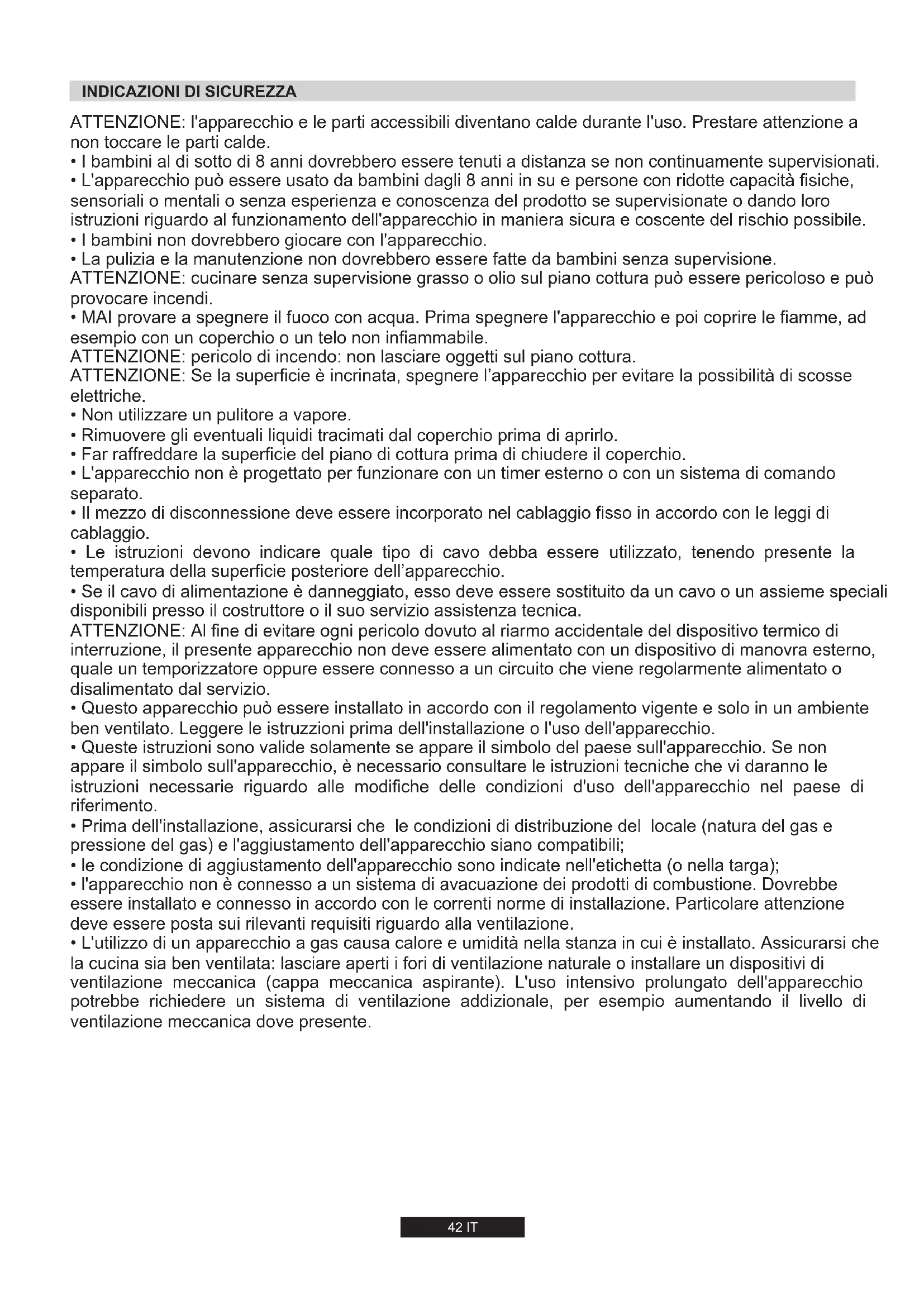 - MAI provare a spegnere il fuoco con acqua. Prima spegnere l'apparecchio e poi coprire le fiamme, ad esempio con un coperchio o un telo non infiammabile. ATTENZIONE: pericolo di incendo: non lasciare oggetti sul piano cottura. ATTENZIONE: Se la superficie è incrinata, spegnere l’apparecchio per evitare la possibilità di scosse elettriche.