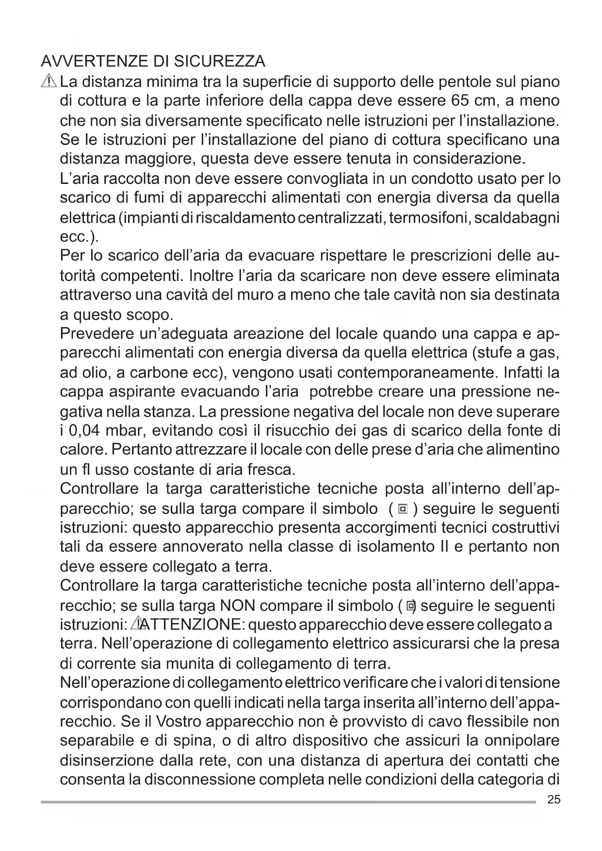 La distanza minima tra la superfi cie di supporto delle pentole sul piano di cottura e la parte inferiore della cappa deve essere 65 cm, a meno che non sia diversamente specifi cato nelle istruzioni per l’installazione. Se le istruzioni per l’installazione del piano di cottura specifi cano una distanza maggiore, questa deve essere tenuta in considerazione. L’aria raccolta non deve essere convogliata in un condotto usato per lo scarico di fumi di apparecchi alimentati con energia diversa da quella elettrica (impianti di riscaldamento centralizzati, termosifoni, scaldabagni ecc.). Per lo scarico dell’aria da evacuare rispettare le prescrizioni delle au- torità competenti. Inoltre l’aria da scaricare non deve essere eliminata attraverso una cavità del muro a meno che tale cavità non sia destinata a questo scopo. Prevedere un’adeguata areazione del locale quando una cappa e ap- parecchi alimentati con energia diversa da quella elettrica (stufe a gas, ad olio, a carbone ecc), vengono usati contemporaneamente. Infatti la cappa aspirante evacuando l’aria potrebbe creare una pressione ne- gativa nella stanza. La pressione negativa del locale non deve superare i 0,04 mbar, evitando così il risucchio dei gas di scarico della fonte di calore. Pertanto attrezzare il locale con delle prese d’aria che alimentino un fl usso costante di aria fresca. Controllare la targa caratteristiche tecniche posta all’interno dell’ap- parecchio; se sulla targa compare il simbolo ( ) seguire le seguenti istruzioni: questo apparecchio presenta accorgimenti tecnici costruttivi tali da essere annoverato nella classe di isolamento II e pertanto non deve essere collegato a terra. Controllare la targa caratteristiche tecniche posta all’interno dell’appa- recchio; se sulla targa NON compare il simbolo ( ) seguire le seguenti istruzioni: ATTENZIONE: questo apparecchio deve essere collegato a terra. Nell’operazione di collegamento elettrico assicurarsi che la presa di corrente sia munita di collegamento di terra. Nell’operazione di collegamento elettrico verifi care che i valori di tensione corrispondano con quelli indicati nella targa inserita all’interno dell’appa- recchio. Se il Vostro apparecchio non è provvisto di cavo fl essibile non separabile e di spina, o di altro dispositivo che assicuri la onnipolare disinserzione dalla rete, con una distanza di apertura dei contatti che consenta la disconnessione completa nelle condizioni della categoria di26 sovratensione III, allora tali dispositivi di separazione dalla rete devono essere previsti nella rete di alimentazione conformemente alle regole di installazione. Se il Vostro apparecchio è provvisto di cavo alimentazione e di spina, porre l’apparecchio in modo che la spina sia accessibile. Prima di procedere a qualsiasi operazione di pulizia o manutenzione è necessario togliere tensione. Se il cavo di alimentazione è danneggiato, esso deve essere sostituito dal costruttore o dal suo servizio assistenza tecnica o comunque da una persona con qualifi ca similare, in modo da prevenire ogni rischio. Attenzione: la mancata installazione delle viti o dispositivi di fi ssaggio in conformità con queste istruzioni può comportare rischi di natura elettrica. L’installazione va effettuata secondo queste istruzioni e da personale professionalmente qualifi cato. Evitare l’uso di materiali che causano fi ammate (fl ambè) nelle immediate vicinanze dell’apparecchio. Non cucinare “fl ambè” sotto la cappa. Nel caso di fritture fare particolarmente attenzione al pericolo di incendio che costituiscono olio e grassi. Particolarmente pericoloso per la sua infi ammabilità è l’olio già usato. Non usare griglie elettriche scoperte. Per evitare un possibile rischio di incendio attenersi alle istruzioni indicate per la pulizia dei fi ltri antigrasso e la rimozione di eventuali depositi di grasso sull’apparecchio. L’apparecchio può essere utilizzato da bambini di età non inferiore a 8 anni e da persone con ridotte capacità fi siche, sensoriali o mentali, o prive di esperienza o della necessaria conoscenza, purché sotto sorve- glianza oppure dopo che le stesse abbiano ricevuto istruzioni da persone responsabili della loro sicurezza relative all’uso sicuro dell’apparecchio e alla comprensione dei pericoli ad esso inerenti. I bambini non devono giocare con l’apparecchio. La pulizia e la manutenzione destinata ad essere effettuata dall’utilizzatore non deve essere effettuata da bambini senza sorveglianza. Attenzione: parti accessibili possono diventare calde quando usate con apparecchi di cottura. Questa cappa da cucina è destinata ad essere installata sopra cucine per uso domestico, dispositivi di cottura e apparecchi per cucine similari.27 CONSIDERAZIONI AMBIENTALI Riciclare i materiali con il simbolo . Buttare l’imballaggio negli appositi contenitori per il riciclaggio. Aiutare a proteggere l’ambiente e la salute umana e a riciclare rifi uti derivanti da apparecchiature elettriche ed elettroniche. Non smaltire le apparecchiature che riportano il simbolo insieme ai normali rifi uti domestici. Portare il prodotto al punto di riciclaggio più vicino o contattare il comune di residenza. USO FILTRANTE O ASPIRANTE ? La cappa puo’ essere in versione aspirante o in versione fi ltrante. Decidere sin dall’inizio il tipo di installazione. Per una maggiore effi cienza, consigliamo di instal- lare la cappa in versione aspirante (se possibile). Versione aspirante. La cappa depura l’aria e la espelle all’esterno attraverso un condotto di scarico. Versione fi ltrante La cappa depura l’aria e la re-immette pulita nella stanza. MANUTENZIONE Un’accurata manutenzione garantisce un buon funzio namento ed un buon rendimento nel tempo. La rimozione di eventuali depositi di grasso dall’apparecchio va effettuata periodicamente in rapporto all’uso (almeno ogni 2 mesi). Evitare l’uso di prodotti contenenti abrasivi o corrosivi. Per l